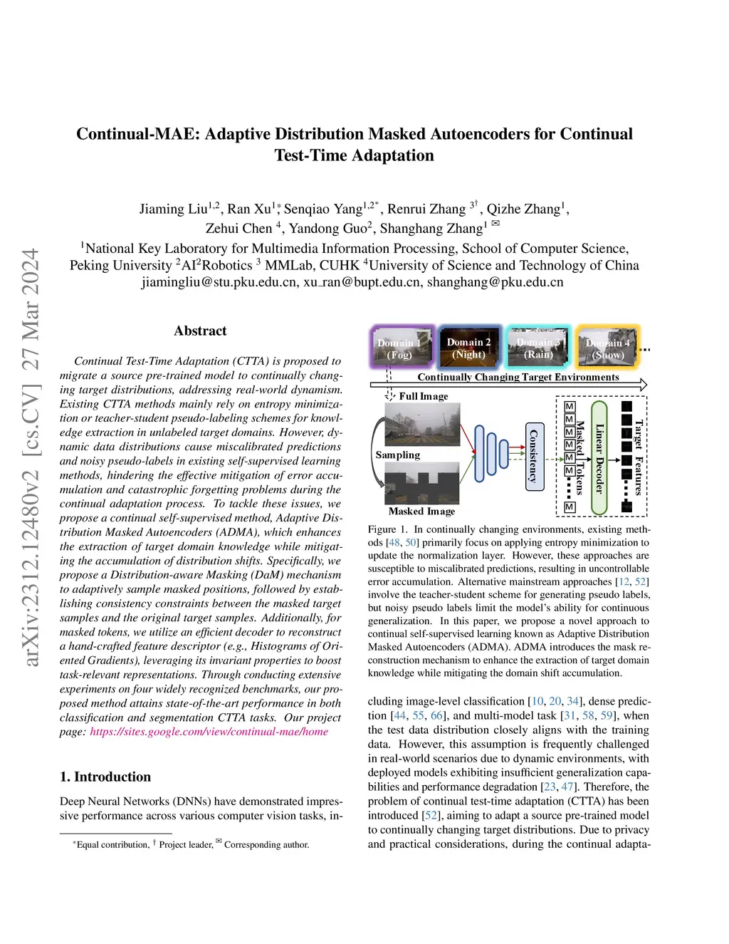Continual Test-Time Adaptation (CTTA) is proposed to migrate a source pre-trained model to continually changing target distributions, addressing real-world dynamism. Existing CTTA methods mainly rely on entropy minimization or teacher-student pseudo-labeling schemes for knowledge extraction in unlabeled target domains. However, dynamic data distributions cause miscalibrated predictions and noisy pseudo-labels in existing self-supervised learning methods, hindering the effective mitigation of error accumulation and catastrophic forgetting problems during the continual adaptation process. To tackle these issues, we propose a continual self-supervised method, Adaptive Distribution Masked Autoencoders (ADMA), which enhances the extraction of target domain knowledge while mitigating the accumulation of distribution shifts. Specifically, we propose a Distribution-aware Masking (DaM) mechanism to adaptively sample masked positions, followed by establishing consistency constraints between the masked target samples and the original target samples. Additionally, for masked tokens, we utilize an efficient decoder to reconstruct a hand-crafted feature descriptor (e.g., Histograms of Oriented Gradients), leveraging its invariant properties to boost task-relevant representations. Through conducting extensive experiments on four widely recognized benchmarks, our proposed method attains state-of-the-art performance in both classification and segmentation CTTA tasks. Our project page: https://sites.google.com/view/continual-mae/home.