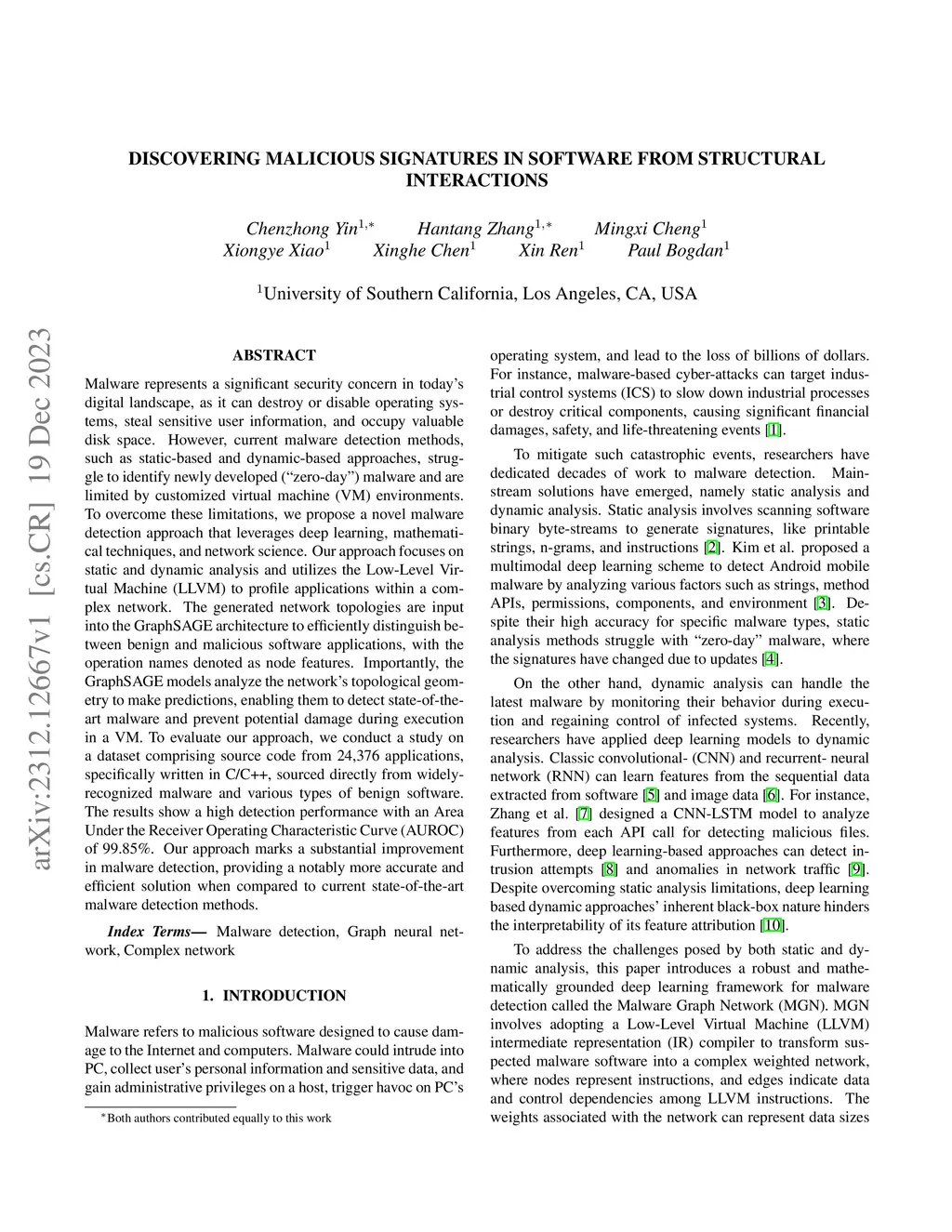 Malware represents a significant security concern in today's digital landscape, as it can destroy or disable operating systems, steal sensitive user information, and occupy valuable disk space. However, current malware detection methods, such as static-based and dynamic-based approaches, struggle to identify newly developed (``zero-day") malware and are limited by customized virtual machine (VM) environments. To overcome these limitations, we propose a novel malware detection approach that leverages deep learning, mathematical techniques, and network science. Our approach focuses on static and dynamic analysis and utilizes the Low-Level Virtual Machine (LLVM) to profile applications within a complex network. The generated network topologies are input into the GraphSAGE architecture to efficiently distinguish between benign and malicious software applications, with the operation names denoted as node features. Importantly, the GraphSAGE models analyze the network's topological geometry to make predictions, enabling them to detect state-of-the-art malware and prevent potential damage during execution in a VM. To evaluate our approach, we conduct a study on a dataset comprising source code from 24,376 applications, specifically written in C/C++, sourced directly from widely-recognized malware and various types of benign software. The results show a high detection performance with an Area Under the Receiver Operating Characteristic Curve (AUROC) of 99.85%. Our approach marks a substantial improvement in malware detection, providing a notably more accurate and efficient solution when compared to current state-of-the-art malware detection methods.