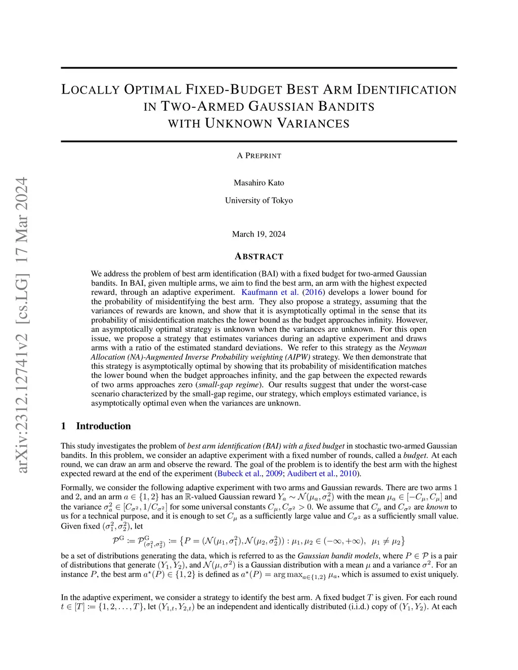We address the problem of best arm identification (BAI) with a fixed budget for two-armed Gaussian bandits. In BAI, given multiple arms, we aim to find the best arm, an arm with the highest expected reward, through an adaptive experiment. Kaufmann et al. (2016) develops a lower bound for the probability of misidentifying the best arm. They also propose a strategy, assuming that the variances of rewards are known, and show that it is asymptotically optimal in the sense that its probability of misidentification matches the lower bound as the budget approaches infinity. However, an asymptotically optimal strategy is unknown when the variances are unknown. For this open issue, we propose a strategy that estimates variances during an adaptive experiment and draws arms with a ratio of the estimated standard deviations. We refer to this strategy as the Neyman Allocation (NA)-Augmented Inverse Probability weighting (AIPW) strategy. We then demonstrate that this strategy is asymptotically optimal by showing that its probability of misidentification matches the lower bound when the budget approaches infinity, and the gap between the expected rewards of two arms approaches zero (small-gap regime). Our results suggest that under the worst-case scenario characterized by the small-gap regime, our strategy, which employs estimated variance, is asymptotically optimal even when the variances are unknown.