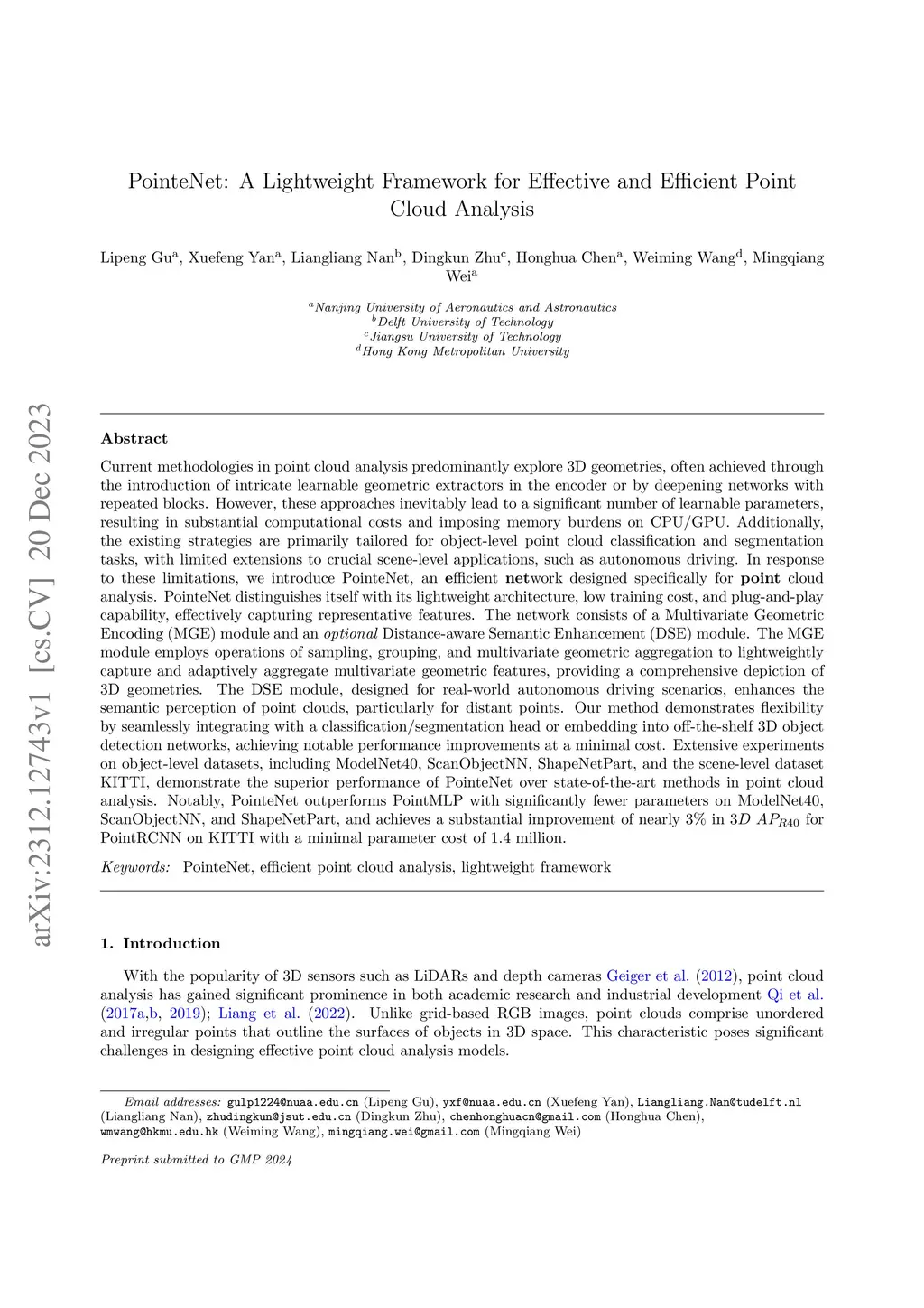 Current methodologies in point cloud analysis predominantly explore 3D geometries, often achieved through the introduction of intricate learnable geometric extractors in the encoder or by deepening networks with repeated blocks. However, these approaches inevitably lead to a significant number of learnable parameters, resulting in substantial computational costs and imposing memory burdens on CPU/GPU. Additionally, the existing strategies are primarily tailored for object-level point cloud classification and segmentation tasks, with limited extensions to crucial scene-level applications, such as autonomous driving. In response to these limitations, we introduce PointeNet, an efficient network designed specifically for point cloud analysis. PointeNet distinguishes itself with its lightweight architecture, low training cost, and plug-and-play capability, effectively capturing representative features. The network consists of a Multivariate Geometric Encoding (MGE) module and an optional Distance-aware Semantic Enhancement (DSE) module. The MGE module employs operations of sampling, grouping, and multivariate geometric aggregation to lightweightly capture and adaptively aggregate multivariate geometric features, providing a comprehensive depiction of 3D geometries. The DSE module, designed for real-world autonomous driving scenarios, enhances the semantic perception of point clouds, particularly for distant points. Our method demonstrates flexibility by seamlessly integrating with a classification/segmentation head or embedding into off-the-shelf 3D object detection networks, achieving notable performance improvements at a minimal cost. Extensive experiments on object-level datasets, including ModelNet40, ScanObjectNN, ShapeNetPart, and the scene-level dataset KITTI, demonstrate the superior performance of PointeNet over state-of-the-art methods in point cloud analysis.