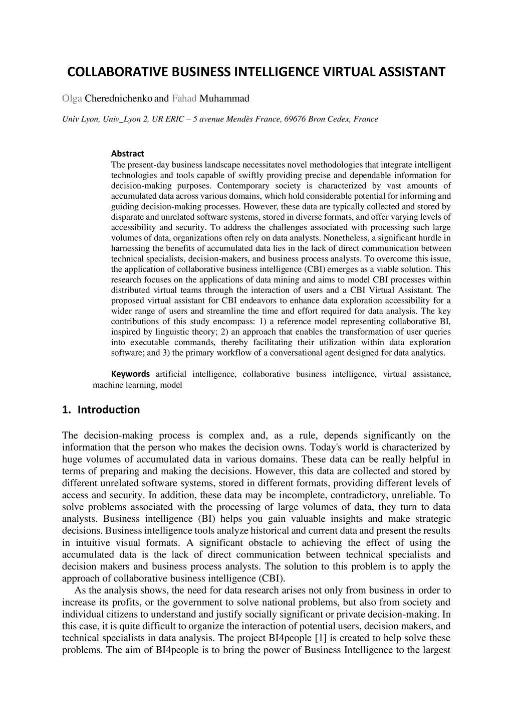 The present-day business landscape necessitates novel methodologies that integrate intelligent technologies and tools capable of swiftly providing precise and dependable information for decision-making purposes. Contemporary society is characterized by vast amounts of accumulated data across various domains, which hold considerable potential for informing and guiding decision-making processes. However, these data are typically collected and stored by disparate and unrelated software systems, stored in diverse formats, and offer varying levels of accessibility and security. To address the challenges associated with processing such large volumes of data, organizations often rely on data analysts. Nonetheless, a significant hurdle in harnessing the benefits of accumulated data lies in the lack of direct communication between technical specialists, decision-makers, and business process analysts. To overcome this issue, the application of collaborative business intelligence (CBI) emerges as a viable solution. This research focuses on the applications of data mining and aims to model CBI processes within distributed virtual teams through the interaction of users and a CBI Virtual Assistant. The proposed virtual assistant for CBI endeavors to enhance data exploration accessibility for a wider range of users and streamline the time and effort required for data analysis. The key contributions of this study encompass: 1) a reference model representing collaborative BI, inspired by linguistic theory; 2) an approach that enables the transformation of user queries into executable commands, thereby facilitating their utilization within data exploration software; and 3) the primary workflow of a conversational agent designed for data analytics.