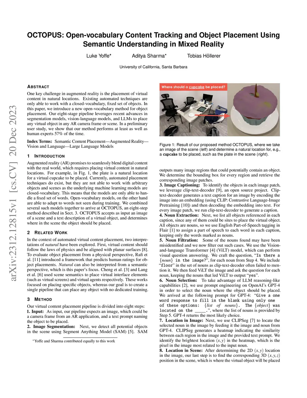 One key challenge in augmented reality is the placement of virtual content in natural locations. Existing automated techniques are only able to work with a closed-vocabulary, fixed set of objects. In this paper, we introduce a new open-vocabulary method for object placement. Our eight-stage pipeline leverages recent advances in segmentation models, vision-language models, and LLMs to place any virtual object in any AR camera frame or scene. In a preliminary user study, we show that our method performs at least as well as human experts 57% of the time.
