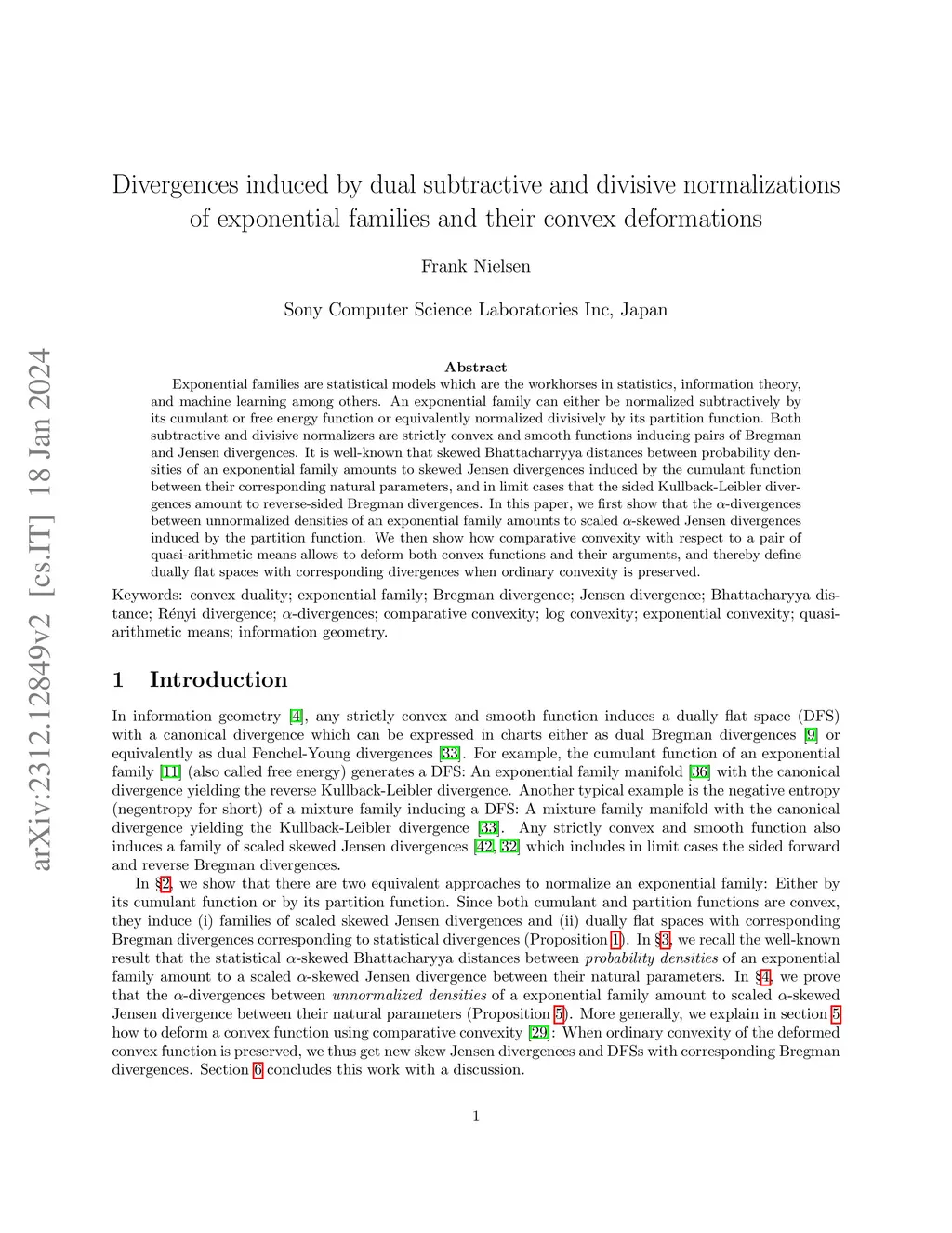 Exponential families are statistical models which are the workhorses in statistics, information theory, and machine learning among others. An exponential family can either be normalized subtractively by its cumulant or free energy function or equivalently normalized divisively by its partition function. Both subtractive and divisive normalizers are strictly convex and smooth functions inducing pairs of Bregman and Jensen divergences. It is well-known that skewed Bhattacharryya distances between probability densities of an exponential family amounts to skewed Jensen divergences induced by the cumulant function between their corresponding natural parameters, and in limit cases that the sided Kullback-Leibler divergences amount to reverse-sided Bregman divergences. In this paper, we first show that the -divergences between unnormalized densities of an exponential family amounts to scaled -skewed Jensen divergences induced by the partition function. We then show how comparative convexity with respect to a pair of quasi-arithmetic means allows to deform both convex functions and their arguments, and thereby define dually flat spaces with corresponding divergences when ordinary convexity is preserved.