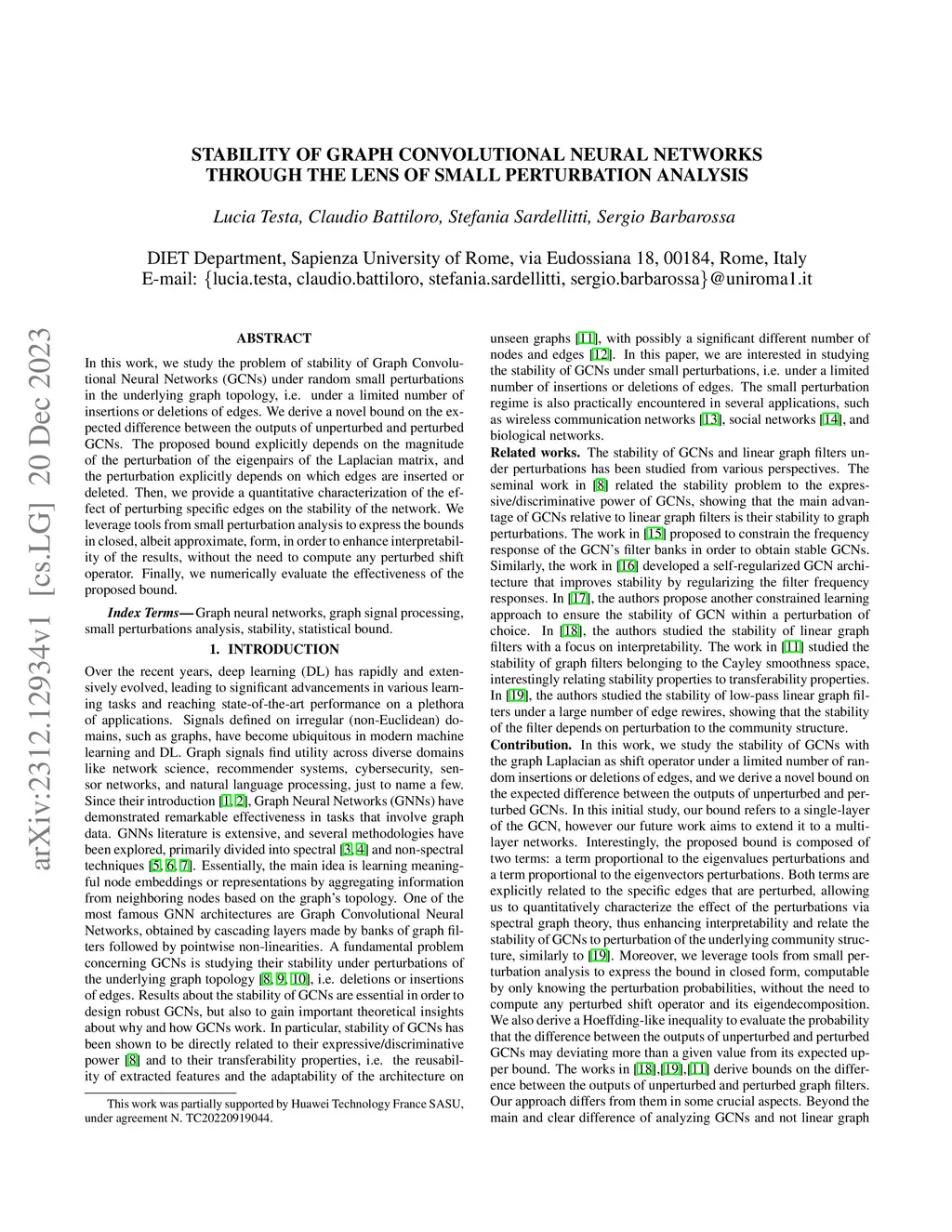 In this work, we study the problem of stability of Graph Convolutional Neural Networks (GCNs) under random small perturbations in the underlying graph topology, i.e. under a limited number of insertions or deletions of edges. We derive a novel bound on the expected difference between the outputs of unperturbed and perturbed GCNs. The proposed bound explicitly depends on the magnitude of the perturbation of the eigenpairs of the Laplacian matrix, and the perturbation explicitly depends on which edges are inserted or deleted. Then, we provide a quantitative characterization of the effect of perturbing specific edges on the stability of the network. We leverage tools from small perturbation analysis to express the bounds in closed, albeit approximate, form, in order to enhance interpretability of the results, without the need to compute any perturbed shift operator. Finally, we numerically evaluate the effectiveness of the proposed bound.
