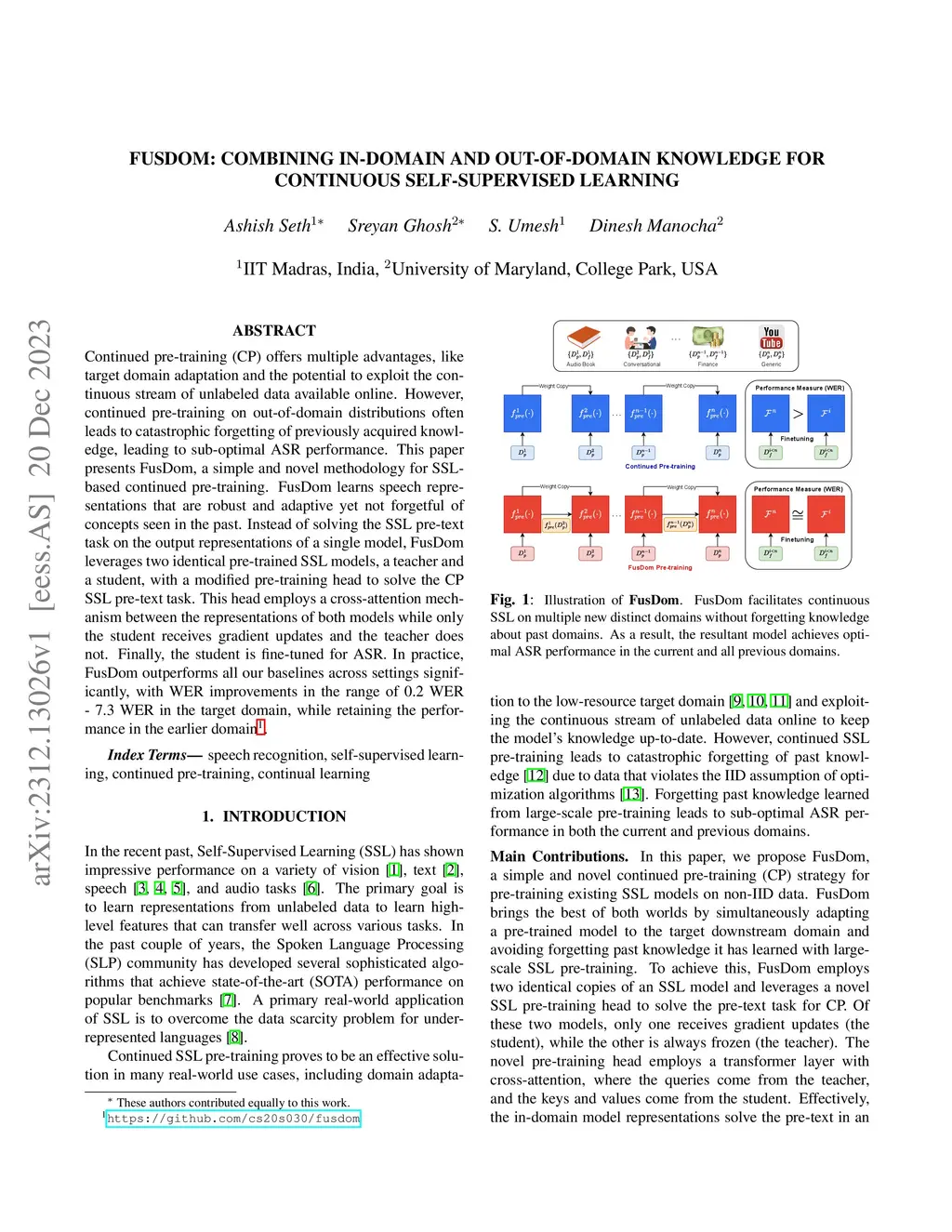 Continued pre-training (CP) offers multiple advantages, like target domain adaptation and the potential to exploit the continuous stream of unlabeled data available online. However, continued pre-training on out-of-domain distributions often leads to catastrophic forgetting of previously acquired knowledge, leading to sub-optimal ASR performance. This paper presents FusDom, a simple and novel methodology for SSL-based continued pre-training. FusDom learns speech representations that are robust and adaptive yet not forgetful of concepts seen in the past. Instead of solving the SSL pre-text task on the output representations of a single model, FusDom leverages two identical pre-trained SSL models, a teacher and a student, with a modified pre-training head to solve the CP SSL pre-text task. This head employs a cross-attention mechanism between the representations of both models while only the student receives gradient updates and the teacher does not. Finally, the student is fine-tuned for ASR. In practice, FusDom outperforms all our baselines across settings significantly, with WER improvements in the range of 0.2 WER - 7.3 WER in the target domain while retaining the performance in the earlier domain.