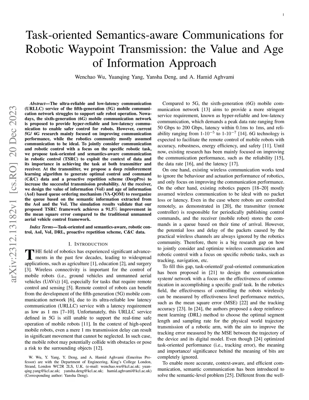 The ultra-reliable and low-latency communication (URLLC) service of the fifth-generation (5G) mobile communication network struggles to support safe robot operation. Nowadays, the sixth-generation (6G) mobile communication network is proposed to provide hyper-reliable and low-latency communication to enable safer control for robots. However, current 5G/ 6G research mainly focused on improving communication performance, while the robotics community mostly assumed communication to be ideal. To jointly consider communication and robotic control with a focus on the specific robotic task, we propose task-oriented and semantics-aware communication in robotic control (TSRC) to exploit the context of data and its importance in achieving the task at both transmitter and receiver. At the transmitter, we propose a deep reinforcement learning algorithm to generate optimal control and command (C&C) data and a proactive repetition scheme (DeepPro) to increase the successful transmission probability. At the receiver, we design the value of information (VoI) and age of information (AoI) based queue ordering mechanism (VA-QOM) to reorganize the queue based on the semantic information extracted from the AoI and the VoI. The simulation results validate that our proposed TSRC framework achieves a 91.5% improvement in the mean square error compared to the traditional unmanned aerial vehicle control framework.