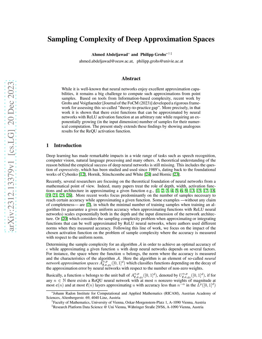 Sampling Complexity of Deep Approximation Spaces