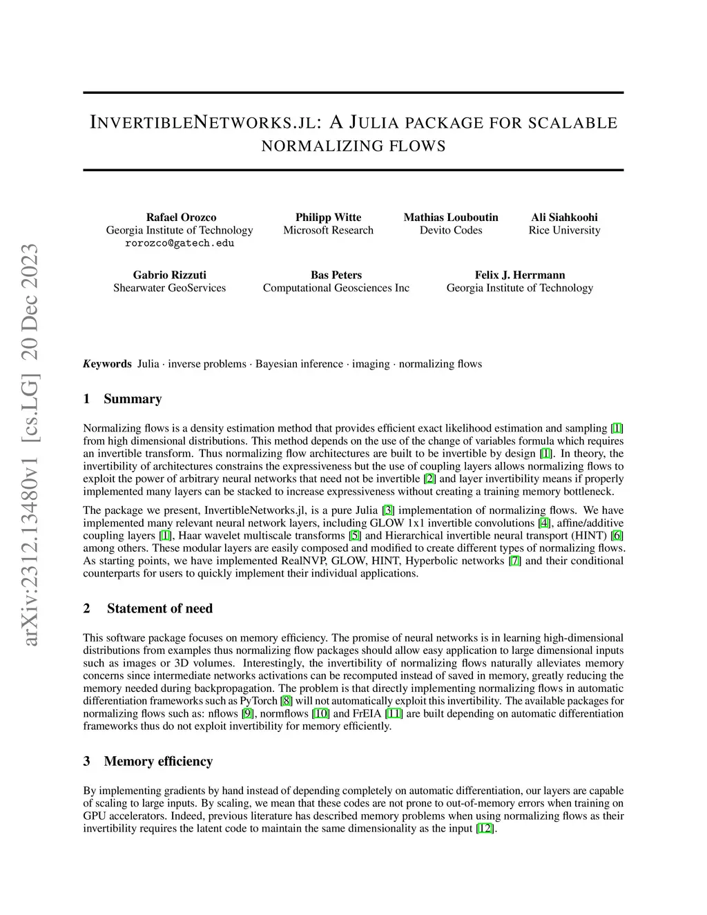 InvertibleNetworks.jl is a Julia package designed for the scalable implementation of normalizing flows, a method for density estimation and sampling in high-dimensional distributions. This package excels in memory efficiency by leveraging the inherent invertibility of normalizing flows, which significantly reduces memory requirements during backpropagation compared to existing normalizing flow packages that rely on automatic differentiation frameworks. InvertibleNetworks.jl has been adapted for diverse applications, including seismic imaging, medical imaging, and CO2 monitoring, demonstrating its effectiveness in learning high-dimensional distributions.
