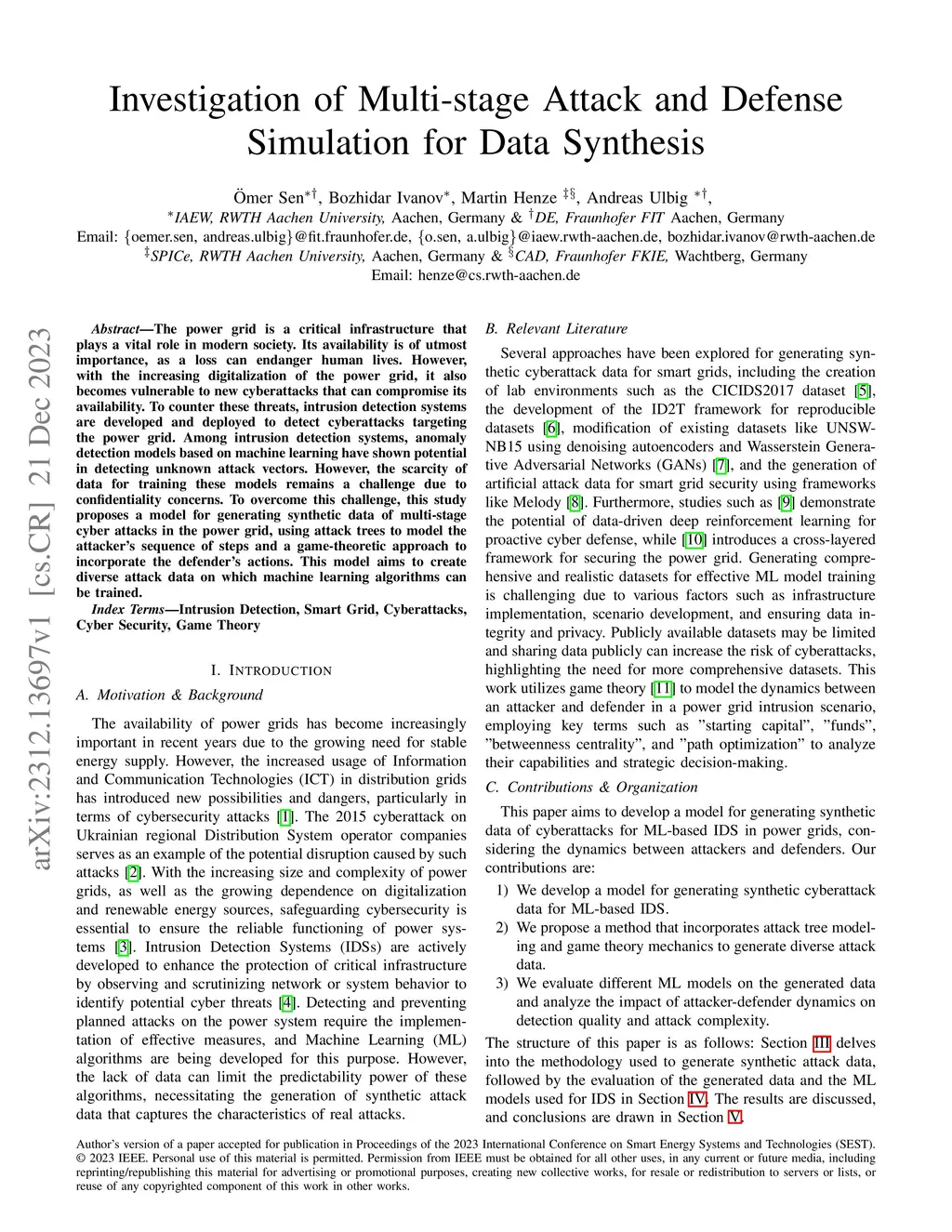 The power grid is a critical infrastructure that plays a vital role in modern society. Its availability is of utmost importance, as a loss can endanger human lives. However, with the increasing digitalization of the power grid, it also becomes vulnerable to new cyberattacks that can compromise its availability. To counter these threats, intrusion detection systems are developed and deployed to detect cyberattacks targeting the power grid. Among intrusion detection systems, anomaly detection models based on machine learning have shown potential in detecting unknown attack vectors. However, the scarcity of data for training these models remains a challenge due to confidentiality concerns. To overcome this challenge, this study proposes a model for generating synthetic data of multi-stage cyber attacks in the power grid, using attack trees to model the attacker's sequence of steps and a game-theoretic approach to incorporate the defender's actions. This model aims to create diverse attack data on which machine learning algorithms can be trained.