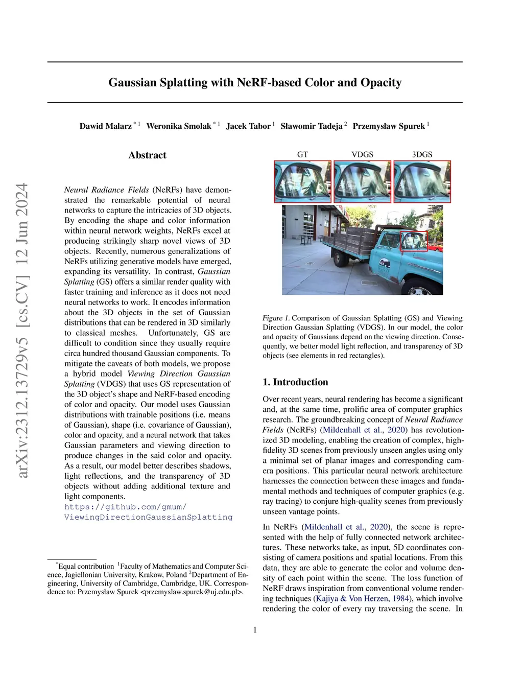 Neural Radiance Fields (NeRFs) have demonstrated the remarkable potential of neural networks to capture the intricacies of 3D objects. By encoding the shape and color information within neural network weights, NeRFs excel at producing strikingly sharp novel views of 3D objects. Recently, numerous generalizations of NeRFs utilizing generative models have emerged, expanding its versatility. In contrast, Gaussian Splatting (GS) offers a similar render quality with faster training and inference as it does not need neural networks to work. It encodes information about the 3D objects in the set of Gaussian distributions that can be rendered in 3D similarly to classical meshes. Unfortunately, GS are difficult to condition since they usually require circa hundred thousand Gaussian components. To mitigate the caveats of both models, we propose a hybrid model Viewing Direction Gaussian Splatting (VDGS) that uses GS representation of the 3D object's shape and NeRF-based encoding of color and opacity. Our model uses Gaussian distributions with trainable positions (i.e. means of Gaussian), shape (i.e. covariance of Gaussian), color and opacity, and a neural network that takes Gaussian parameters and viewing direction to produce changes in the said color and opacity. As a result, our model better describes shadows, light reflections, and the transparency of 3D objects without adding additional texture and light components.