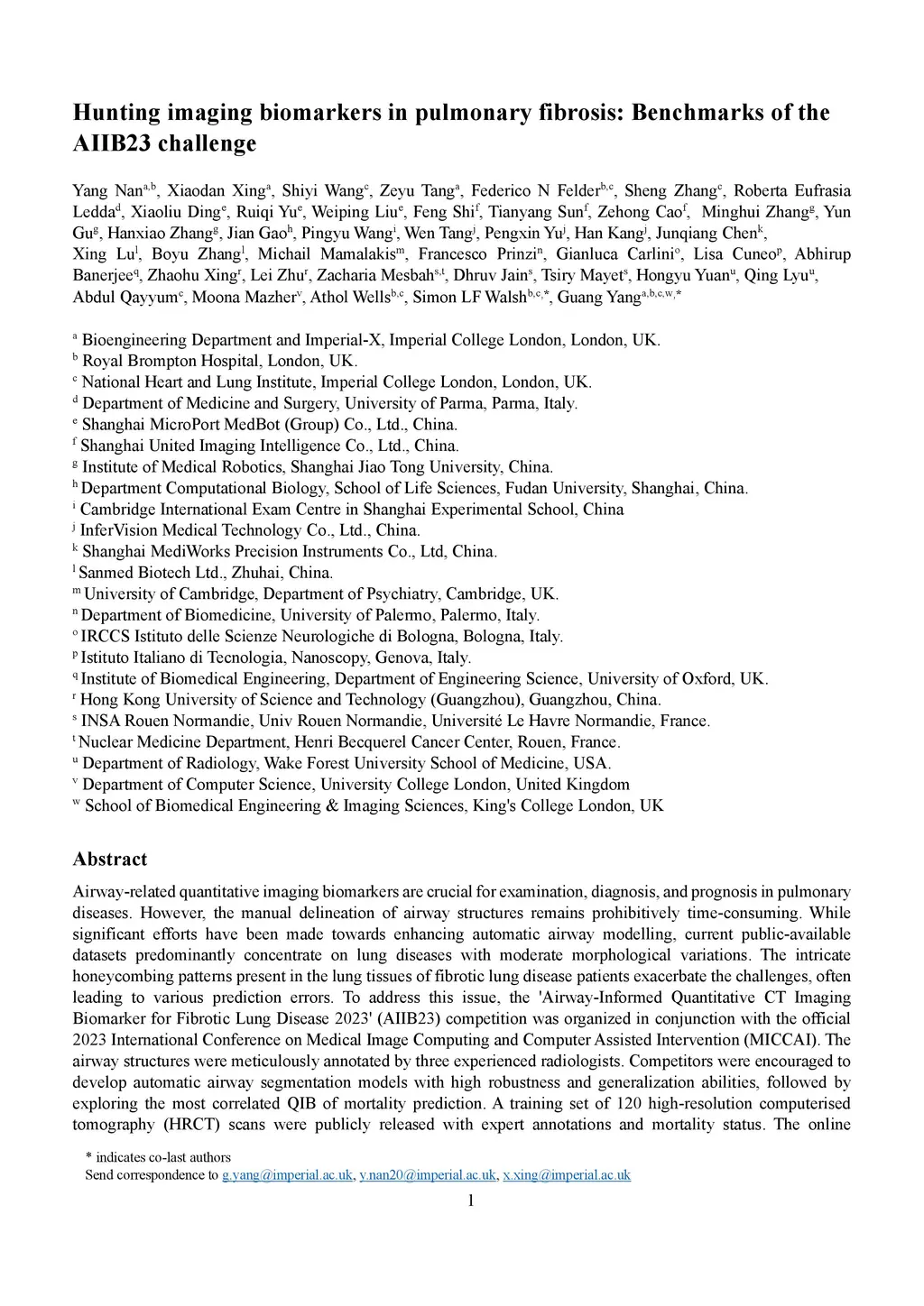 Airway-related quantitative imaging biomarkers are crucial for examination, diagnosis, and prognosis in pulmonary diseases. However, the manual delineation of airway trees remains prohibitively time-consuming. While significant efforts have been made towards enhancing airway modelling, current public-available datasets concentrate on lung diseases with moderate morphological variations. The intricate honeycombing patterns present in the lung tissues of fibrotic lung disease patients exacerbate the challenges, often leading to various prediction errors. To address this issue, the Áirway-Informed Quantitative CT Imaging Biomarker for Fibrotic Lung Disease 2023' (AIIB23) competition was organized in conjunction with the official 2023 International Conference on Medical Image Computing and Computer Assisted Intervention (MICCAI). The airway structures were meticulously annotated by three experienced radiologists. Competitors were encouraged to develop automatic airway segmentation models with high robustness and generalization abilities, followed by exploring the most correlated QIB of mortality prediction. A training set of 120 high-resolution computerised tomography (HRCT) scans were publicly released with expert annotations and mortality status. The online validation set incorporated 52 HRCT scans from patients with fibrotic lung disease and the offline test set included 140 cases from fibrosis and COVID-19 patients. The results have shown that the capacity of extracting airway trees from patients with fibrotic lung disease could be enhanced by introducing voxel-wise weighted general union loss and continuity loss. In addition to the competitive image biomarkers for prognosis, a strong airway-derived biomarker (Hazard ratio>1.5, p<0.0001) was revealed for survival prognostication compared with existing clinical measurements, clinician assessment and AI-based biomarkers.