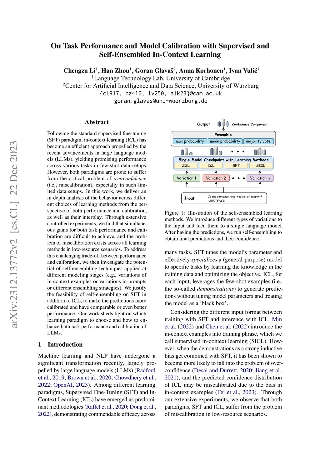 When adapting ICL with or without fine-tuning, we are curious about whether the instruction-tuned language model is able to achieve well-calibrated results without suffering from the problem of overconfidence (i.e., miscalibration) considering its strong instruction following ability, especially in such limited data setups. In this work, we deliver an in-depth analysis of the behavior across different choices of learning methods from the perspective of both performance and calibration. Through extensive controlled experiments, we observe that the miscalibration problem exists across all learning methods in low-resource setups. To achieve simultaneous gain for both in-task performance and calibration, we then study the potential of self-ensembling applied at different modeling stages (e.g., variations of in-context examples or variations in prompts or different ensembling strategies) to make the predictions more calibrated and have comparable or even better performance. We find that self-ensembling with max probability produces robust and calibrated predictions. Our work reveals the potential calibration problem of using ICL despite the improvements in task performance and sheds light on which learning paradigm to choose. We also provide practical guidelines for choosing learning paradigms depending on whether the data has been seen by the model before and a worthwhile solution via self-ensembling on how to enhance both task performance and calibration of LMs, which we hope could encourage further study.