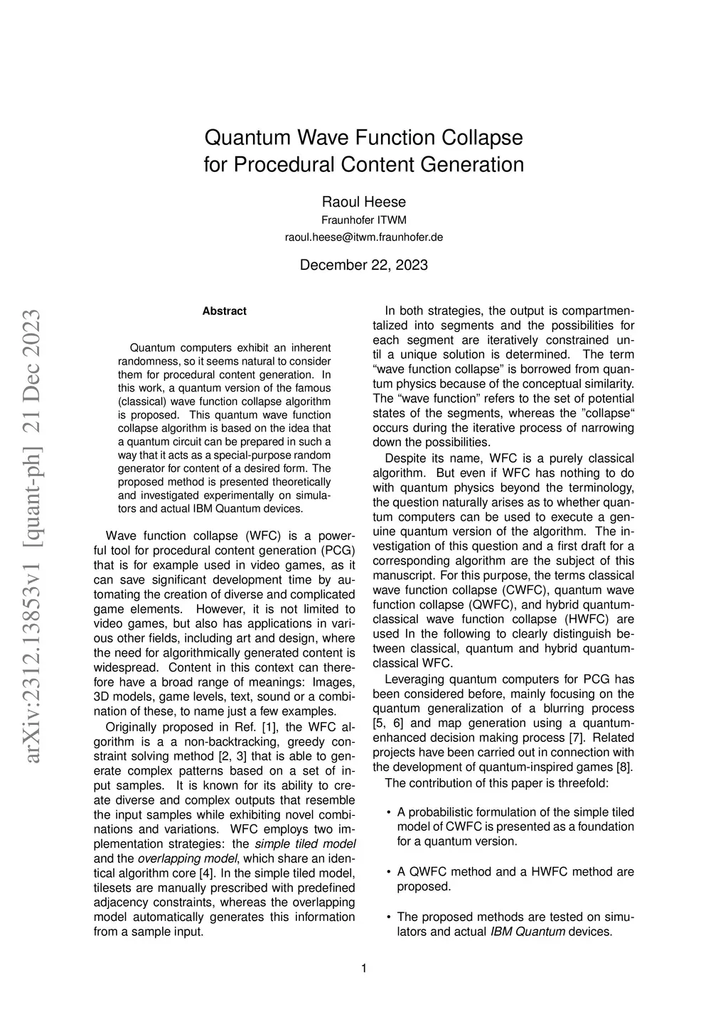 Quantum computers exhibit an inherent randomness, so it seems natural to consider them for procedural content generation. In this work, a quantum version of the famous (classical) wave function collapse algorithm is proposed. This quantum wave function collapse algorithm is based on the idea that a quantum circuit can be prepared in such a way that it acts as a special-purpose random generator for content of a desired form. The proposed method is presented theoretically and investigated experimentally on simulators and actual IBM Quantum devices.