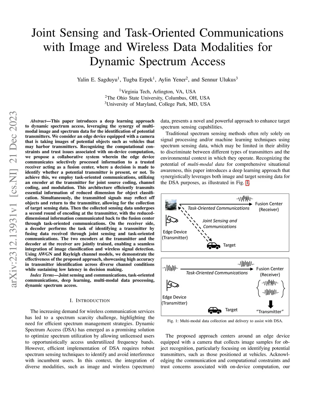 This paper introduces a deep learning approach to dynamic spectrum access, leveraging the synergy of multi-modal image and spectrum data for the identification of potential transmitters. We consider an edge device equipped with a camera that is taking images of potential objects such as vehicles that may harbor transmitters. Recognizing the computational constraints and trust issues associated with on-device computation, we propose a collaborative system wherein the edge device communicates selectively processed information to a trusted receiver acting as a fusion center, where a decision is made to identify whether a potential transmitter is present, or not. To achieve this, we employ task-oriented communications, utilizing an encoder at the transmitter for joint source coding, channel coding, and modulation. This architecture efficiently transmits essential information of reduced dimension for object classification. Simultaneously, the transmitted signals may reflect off objects and return to the transmitter, allowing for the collection of target sensing data. Then the collected sensing data undergoes a second round of encoding at the transmitter, with the reduced-dimensional information communicated back to the fusion center through task-oriented communications. On the receiver side, a decoder performs the task of identifying a transmitter by fusing data received through joint sensing and task-oriented communications. The two encoders at the transmitter and the decoder at the receiver are jointly trained, enabling a seamless integration of image classification and wireless signal detection. Using AWGN and Rayleigh channel models, we demonstrate the effectiveness of the proposed approach, showcasing high accuracy in transmitter identification across diverse channel conditions while sustaining low latency in decision making.
