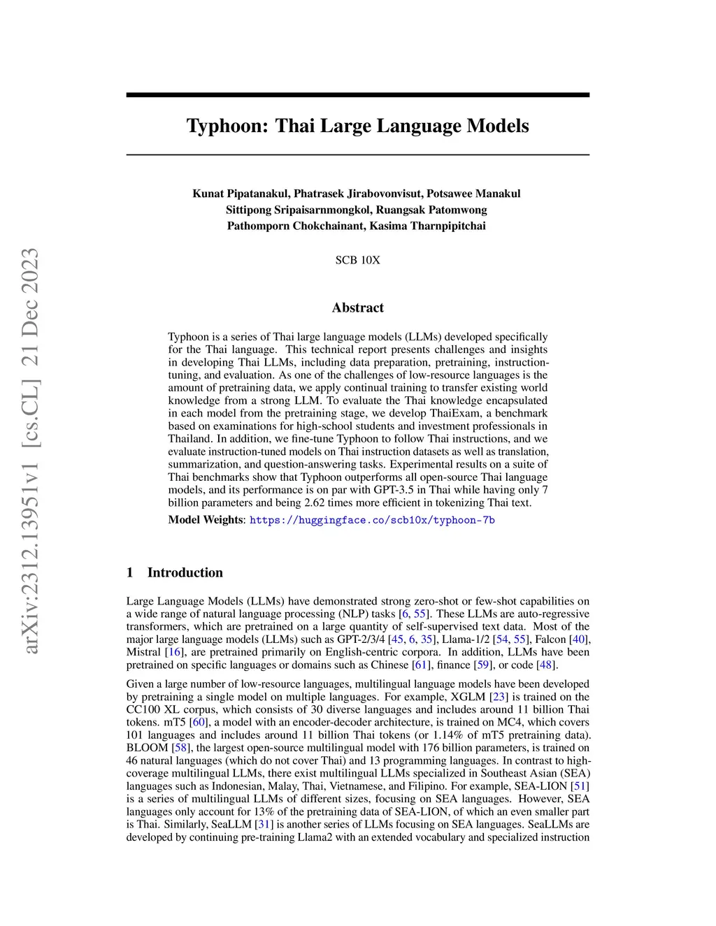 Typhoon is a series of Thai large language models (LLMs) developed specifically for the Thai language. This technical report presents challenges and insights in developing Thai LLMs, including data preparation, pretraining, instruction-tuning, and evaluation. As one of the challenges of low-resource languages is the amount of pretraining data, we apply continual training to transfer existing world knowledge from a strong LLM. To evaluate the Thai knowledge encapsulated in each model from the pretraining stage, we develop ThaiExam, a benchmark based on examinations for high-school students and investment professionals in Thailand. In addition, we fine-tune Typhoon to follow Thai instructions, and we evaluate instruction-tuned models on Thai instruction datasets as well as translation, summarization, and question-answering tasks. Experimental results on a suite of Thai benchmarks show that Typhoon outperforms all open-source Thai language models, and its performance is on par with GPT-3.5 in Thai while having only 7 billion parameters and being 2.62 times more efficient in tokenizing Thai text.