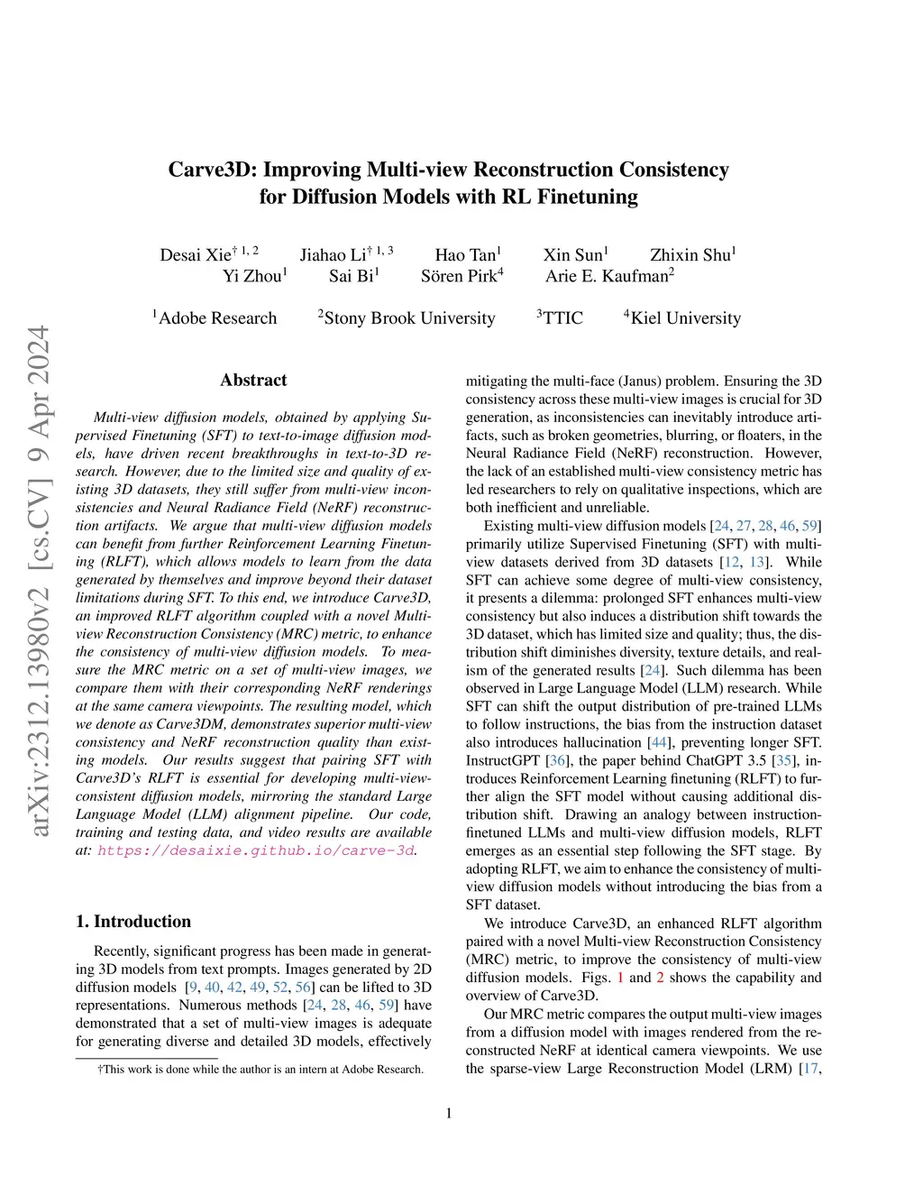 Multi-view diffusion models, obtained by applying Supervised Finetuning (SFT) to text-to-image diffusion models, have driven recent breakthroughs in text-to-3D research. However, due to the limited size and quality of existing 3D datasets, they still suffer from multi-view inconsistencies and Neural Radiance Field (NeRF) reconstruction artifacts. We argue that multi-view diffusion models can benefit from further Reinforcement Learning Finetuning (RLFT), which allows models to learn from the data generated by themselves and improve beyond their dataset limitations during SFT. To this end, we introduce Carve3D, an improved RLFT algorithm coupled with a novel Multi-view Reconstruction Consistency (MRC) metric, to enhance the consistency of multi-view diffusion models. To measure the MRC metric on a set of multi-view images, we compare them with their corresponding NeRF renderings at the same camera viewpoints. The resulting model, which we denote as Carve3DM, demonstrates superior multi-view consistency and NeRF reconstruction quality than existing models. Our results suggest that pairing SFT with Carve3D's RLFT is essential for developing multi-view-consistent diffusion models, mirroring the standard Large Language Model (LLM) alignment pipeline. Our code, training and testing data, and video results are available at: https://desaixie.github.io/carve-3d.