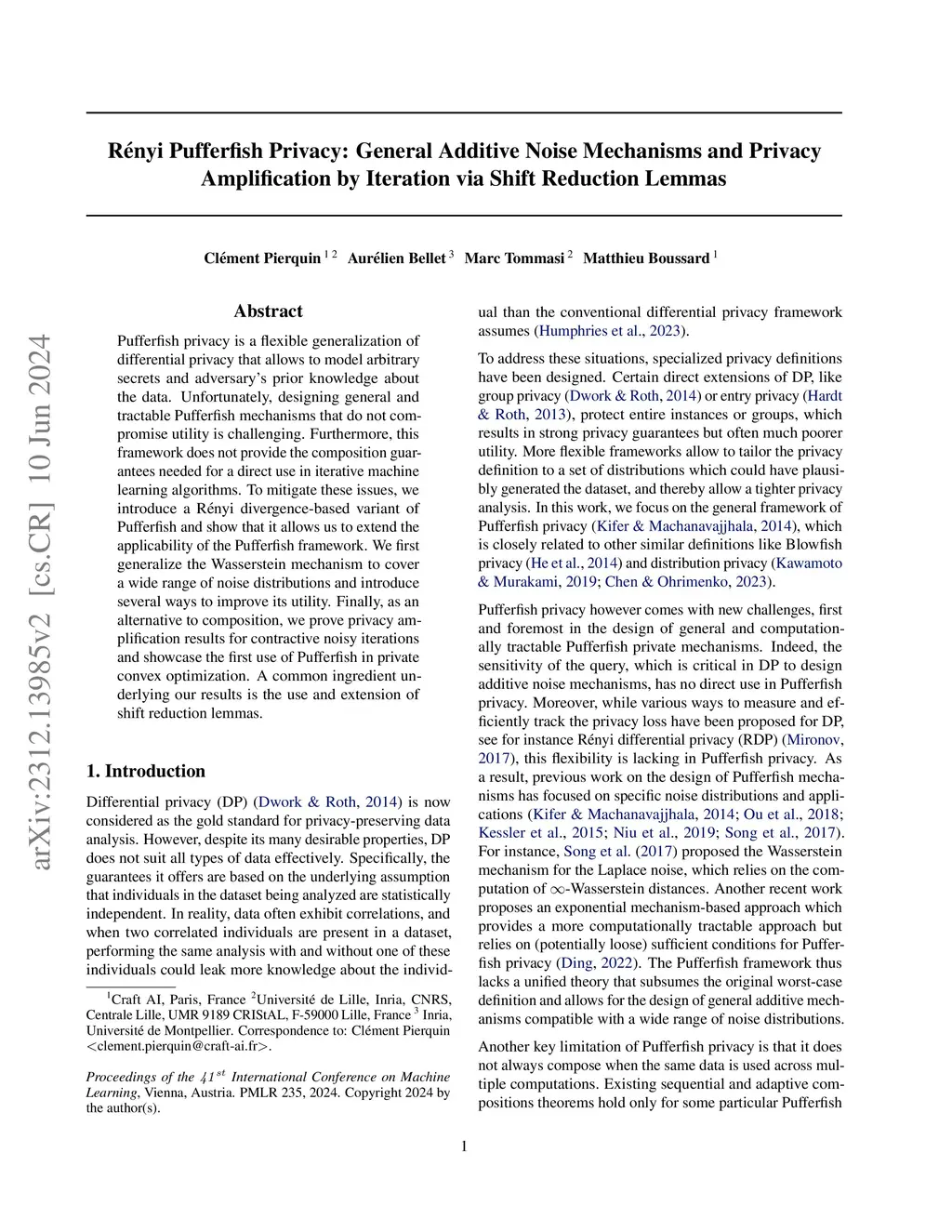 Pufferfish privacy is a flexible generalization of differential privacy that allows to model arbitrary secrets and adversary's prior knowledge about the data. Unfortunately, designing general and tractable Pufferfish mechanisms that do not compromise utility is challenging. Furthermore, this framework does not provide the composition guarantees needed for a direct use in iterative machine learning algorithms. To mitigate these issues, we introduce a R\ényi divergence-based variant of Pufferfish and show that it allows us to extend the applicability of the Pufferfish framework. We first generalize the Wasserstein mechanism to cover a wide range of noise distributions and introduce several ways to improve its utility. We also derive stronger guarantees against out-of-distribution adversaries. Finally, as an alternative to composition, we prove privacy amplification results for contractive noisy iterations and showcase the first use of Pufferfish in private convex optimization. A common ingredient underlying our results is the use and extension of shift reduction lemmas.
