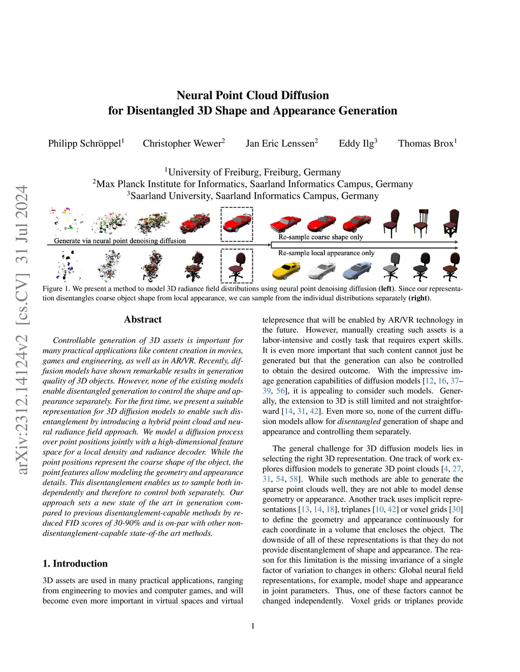 Controllable generation of 3D assets is important for many practical applications like content creation in movies, games and engineering, as well as in AR/VR. Recently, diffusion models have shown remarkable results in generation quality of 3D objects. However, none of the existing models enable disentangled generation to control the shape and appearance separately. For the first time, we present a suitable representation for 3D diffusion models to enable such disentanglement by introducing a hybrid point cloud and neural radiance field approach. We model a diffusion process over point positions jointly with a high-dimensional feature space for a local density and radiance decoder. While the point positions represent the coarse shape of the object, the point features allow modeling the geometry and appearance details. This disentanglement enables us to sample both independently and therefore to control both separately. Our approach sets a new state of the art in generation compared to previous disentanglement-capable methods by reduced FID scores of 30-90% and is on-par with other non disentanglement-capable state-of-the art methods.