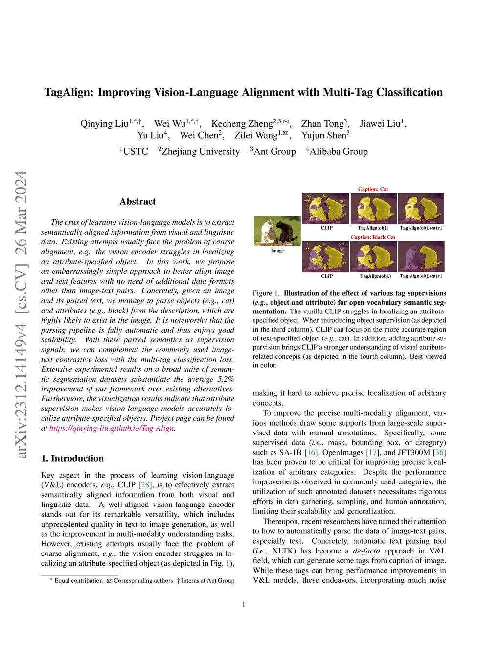The crux of learning vision-language models is to extract semantically aligned information from visual and linguistic data. Existing attempts usually face the problem of coarse alignment, e.g., the vision encoder struggles in localizing an attribute-specified object. In this work, we propose an embarrassingly simple approach to better align image and text features with no need of additional data formats other than image-text pairs. Concretely, given an image and its paired text, we manage to parse objects (e.g., cat) and attributes (e.g., black) from the description, which are highly likely to exist in the image. It is noteworthy that the parsing pipeline is fully automatic and thus enjoys good scalability. With these parsed semantics as supervision signals, we can complement the commonly used image-text contrastive loss with the multi-tag classification loss. Extensive experimental results on a broad suite of semantic segmentation datasets substantiate the average 5.2\% improvement of our framework over existing alternatives. Furthermore, the visualization results indicate that attribute supervision makes vision-language models accurately localize attribute-specified objects. Project page can be found at https://qinying-liu.github.io/Tag-Align.