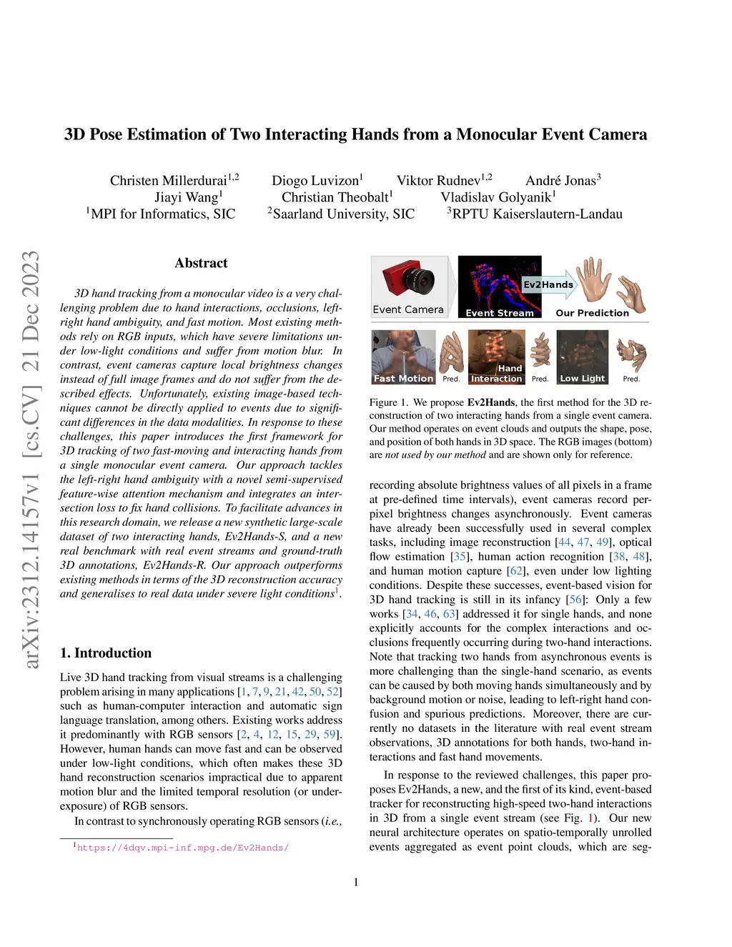 3D hand tracking from a monocular video is a very challenging problem due to hand interactions, occlusions, left-right hand ambiguity, and fast motion. Most existing methods rely on RGB inputs, which have severe limitations under low-light conditions and suffer from motion blur. In contrast, event cameras capture local brightness changes instead of full image frames and do not suffer from the described effects. Unfortunately, existing image-based techniques cannot be directly applied to events due to significant differences in the data modalities. In response to these challenges, this paper introduces the first framework for 3D tracking of two fast-moving and interacting hands from a single monocular event camera. Our approach tackles the left-right hand ambiguity with a novel semi-supervised feature-wise attention mechanism and integrates an intersection loss to fix hand collisions. To facilitate advances in this research domain, we release a new synthetic large-scale dataset of two interacting hands, Ev2Hands-S, and a new real benchmark with real event streams and ground-truth 3D annotations, Ev2Hands-R. Our approach outperforms existing methods in terms of the 3D reconstruction accuracy and generalises to real data under severe light conditions.