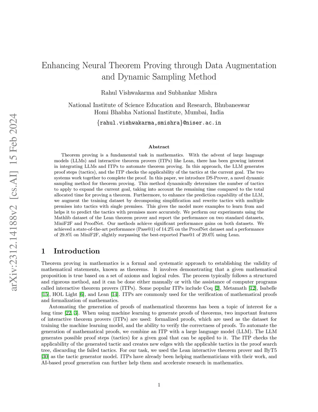 Theorem proving is a fundamental task in mathematics. With the advent of large language models (LLMs) and interactive theorem provers (ITPs) like Lean, there has been growing interest in integrating LLMs and ITPs to automate theorem proving. In this approach, the LLM generates proof steps (tactics), and the ITP checks the applicability of the tactics at the current goal. The two systems work together to complete the proof. In this paper, we introduce DS-Prover, a novel dynamic sampling method for theorem proving. This method dynamically determines the number of tactics to apply to expand the current goal, taking into account the remaining time compared to the total allocated time for proving a theorem. This makes the proof search process more efficient by adjusting the balance between exploration and exploitation as time passes. We also augment the training dataset by decomposing simplification and rewrite tactics with multiple premises into tactics with single premises. This gives the model more examples to learn from and helps it to predict the tactics with premises more accurately. We perform our experiments using the Mathlib dataset of the Lean theorem prover and report the performance on two standard datasets, MiniF2F and ProofNet. Our methods achieve significant performance gains on both datasets. We achieved a state-of-the-art performance (Pass@1) of 14.2% on the ProofNet dataset and a performance of 29.8% on MiniF2F, slightly surpassing the best-reported Pass@1 of 29.6% using Lean.