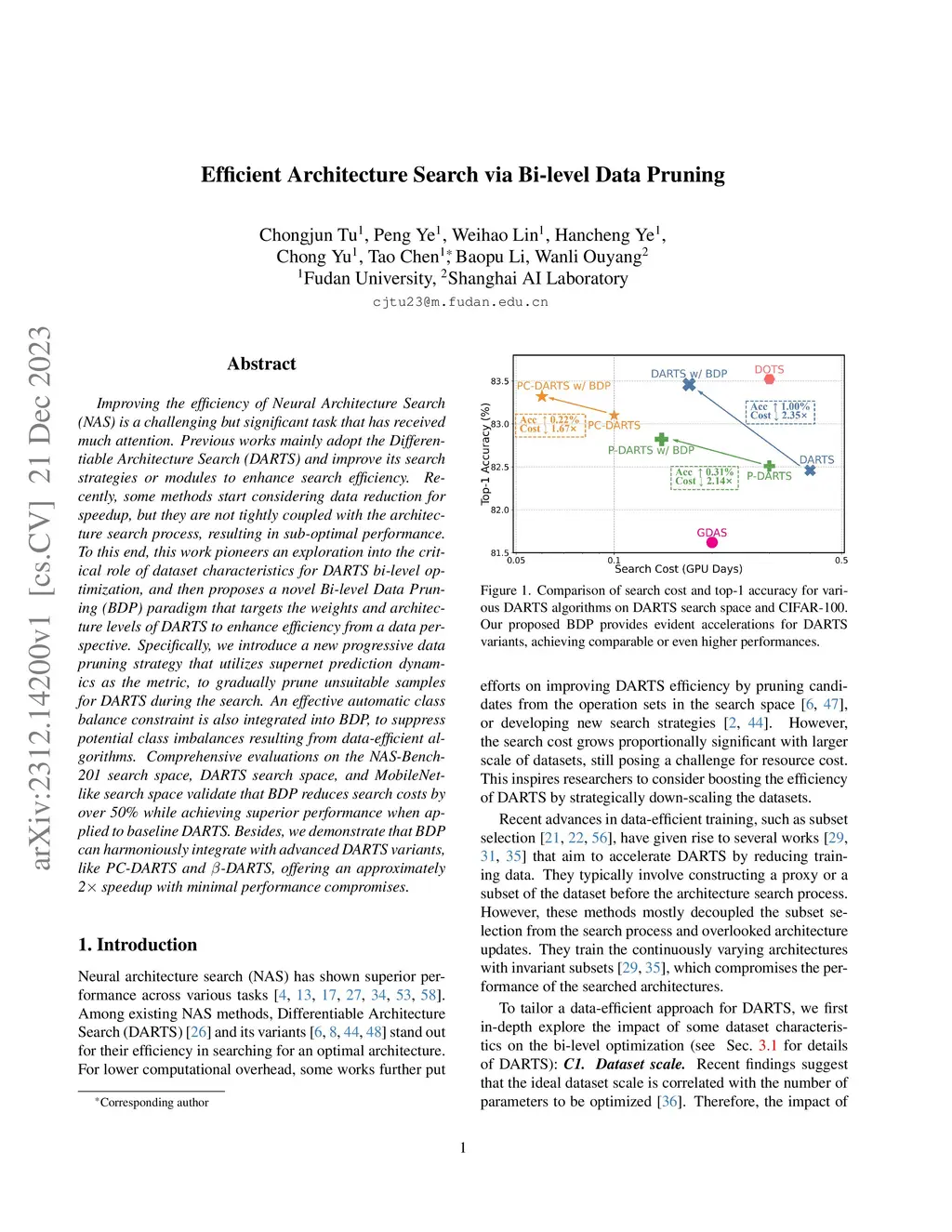 Improving the efficiency of Neural Architecture Search (NAS) is a challenging but significant task that has received much attention. Previous works mainly adopted the Differentiable Architecture Search (DARTS) and improved its search strategies or modules to enhance search efficiency. Recently, some methods have started considering data reduction for speedup, but they are not tightly coupled with the architecture search process, resulting in sub-optimal performance. To this end, this work pioneers an exploration into the critical role of dataset characteristics for DARTS bi-level optimization, and then proposes a novel Bi-level Data Pruning (BDP) paradigm that targets the weights and architecture levels of DARTS to enhance efficiency from a data perspective. Specifically, we introduce a new progressive data pruning strategy that utilizes supernet prediction dynamics as the metric, to gradually prune unsuitable samples for DARTS during the search. An effective automatic class balance constraint is also integrated into BDP, to suppress potential class imbalances resulting from data-efficient algorithms. Comprehensive evaluations on the NAS-Bench-201 search space, DARTS search space, and MobileNet-like search space validate that BDP reduces search costs by over 50% while achieving superior performance when applied to baseline DARTS. Besides, we demonstrate that BDP can harmoniously integrate with advanced DARTS variants, like PC-DARTS and \b{eta}-DARTS, offering an approximately 2 times speedup with minimal performance compromises.