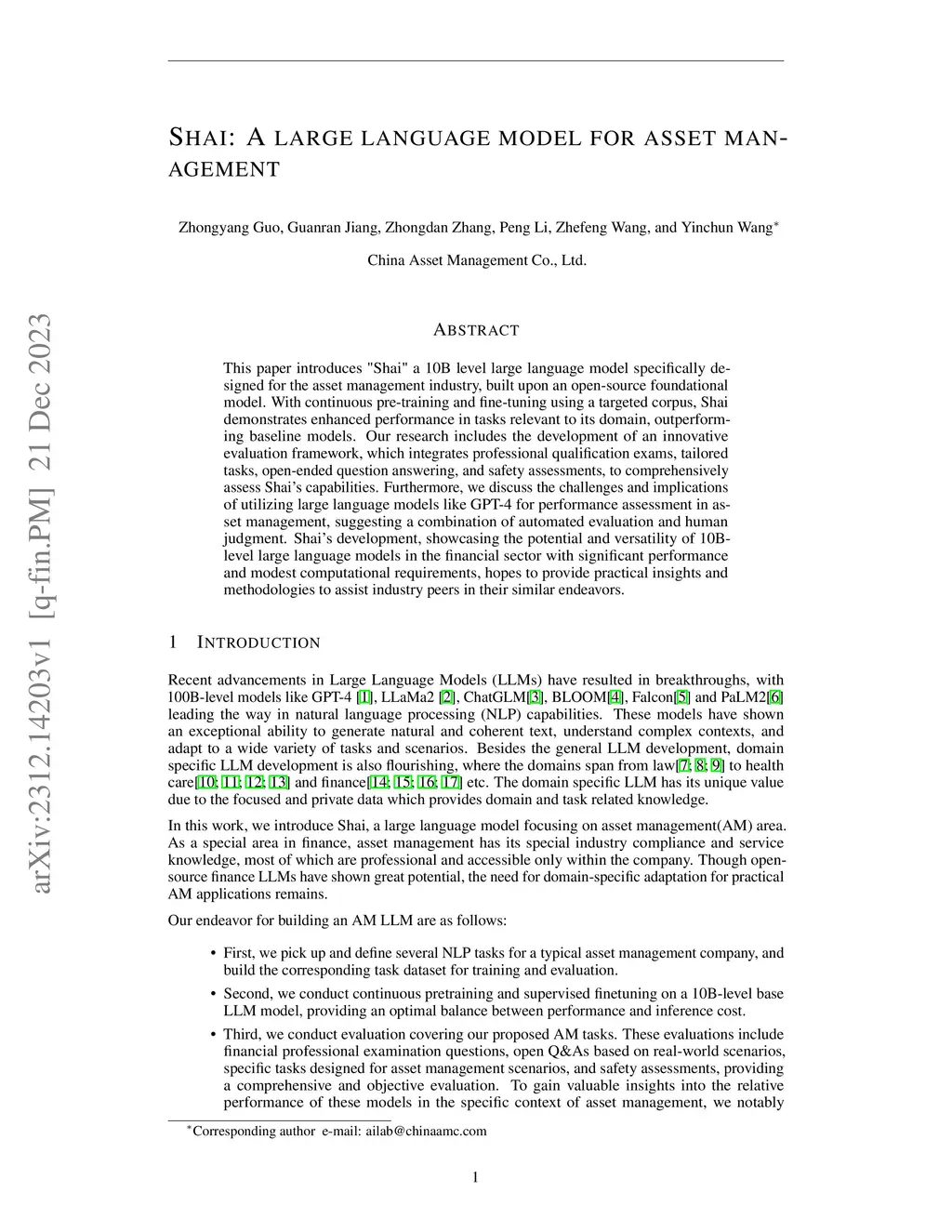 This paper introduces "Shai" a 10B level large language model specifically designed for the asset management industry, built upon an open-source foundational model. With continuous pre-training and fine-tuning using a targeted corpus, Shai demonstrates enhanced performance in tasks relevant to its domain, outperforming baseline models. Our research includes the development of an innovative evaluation framework, which integrates professional qualification exams, tailored tasks, open-ended question answering, and safety assessments, to comprehensively assess Shai's capabilities. Furthermore, we discuss the challenges and implications of utilizing large language models like GPT-4 for performance assessment in asset management, suggesting a combination of automated evaluation and human judgment. Shai's development, showcasing the potential and versatility of 10B-level large language models in the financial sector with significant performance and modest computational requirements, hopes to provide practical insights and methodologies to assist industry peers in their similar endeavors.