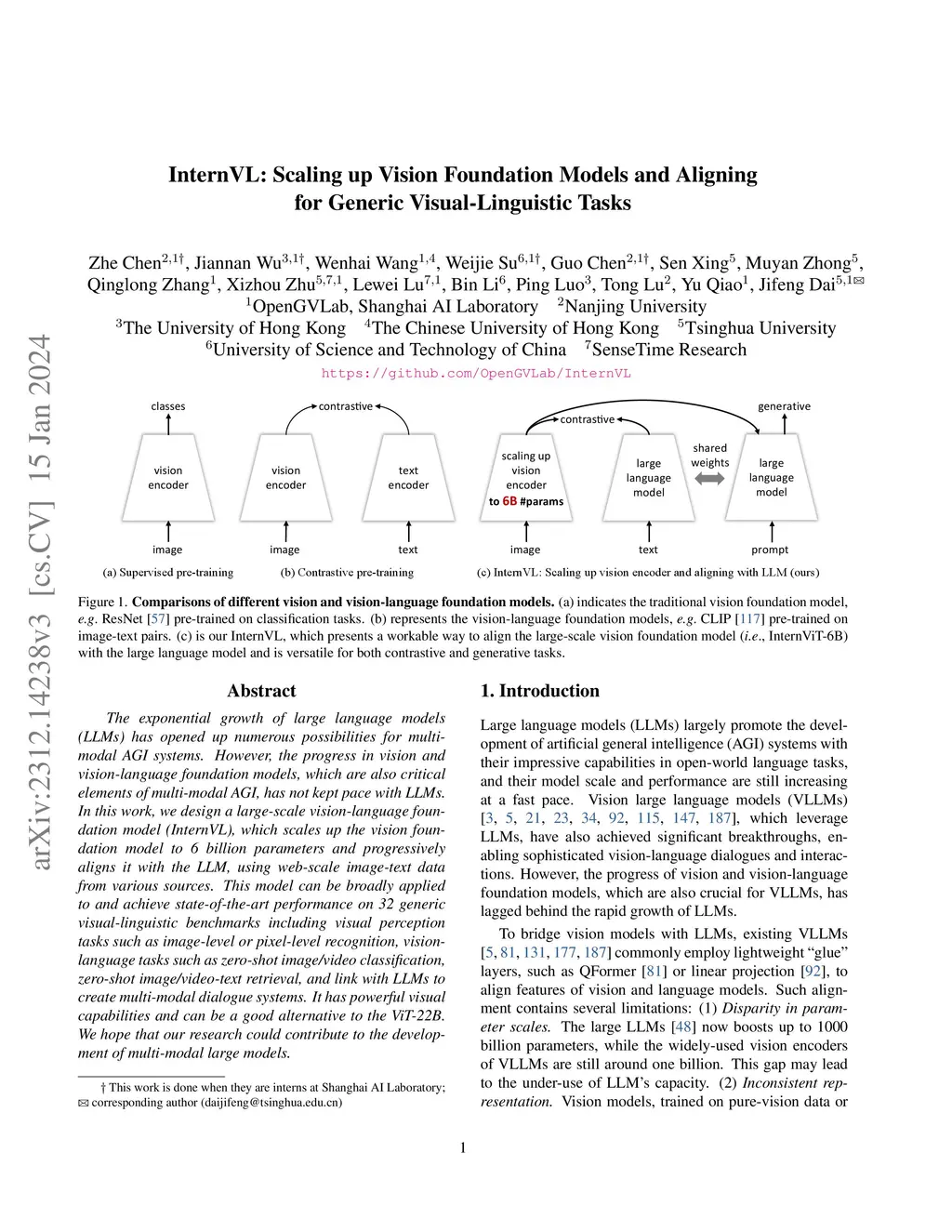 The exponential growth of large language models (LLMs) has opened up numerous possibilities for multimodal AGI systems. However, the progress in vision and vision-language foundation models, which are also critical elements of multi-modal AGI, has not kept pace with LLMs. In this work, we design a large-scale vision-language foundation model (InternVL), which scales up the vision foundation model to 6 billion parameters and progressively aligns it with the LLM, using web-scale image-text data from various sources. This model can be broadly applied to and achieve state-of-the-art performance on 32 generic visual-linguistic benchmarks including visual perception tasks such as image-level or pixel-level recognition, vision-language tasks such as zero-shot image/video classification, zero-shot image/video-text retrieval, and link with LLMs to create multi-modal dialogue systems. It has powerful visual capabilities and can be a good alternative to the ViT-22B. We hope that our research could contribute to the development of multi-modal large models. Code and models are available at https://github.com/OpenGVLab/InternVL.