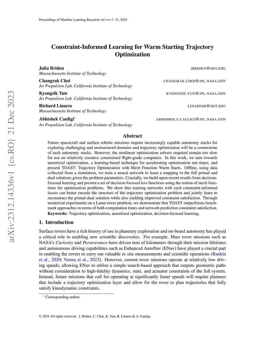 Future spacecraft and surface robotic missions require increasingly capable autonomy stacks for exploring challenging and unstructured domains and trajectory optimization will be a cornerstone of such autonomy stacks. However, the nonlinear optimization solvers required remain too slow for use on relatively resource constrained flight-grade computers. In this work, we turn towards amortized optimization, a learning-based technique for accelerating optimization run times, and present TOAST: Trajectory Optimization with Merit Function Warm Starts. Offline, using data collected from a simulation, we train a neural network to learn a mapping to the full primal and dual solutions given the problem parameters. Crucially, we build upon recent results from decision-focused learning and present a set of decision-focused loss functions using the notion of merit functions for optimization problems. We show that training networks with such constraint-informed losses can better encode the structure of the trajectory optimization problem and jointly learn to reconstruct the primal-dual solution while also yielding improved constraint satisfaction. Through numerical experiments on a Lunar rover problem, we demonstrate that TOAST outperforms benchmark approaches in terms of both computation times and network prediction constraint satisfaction.