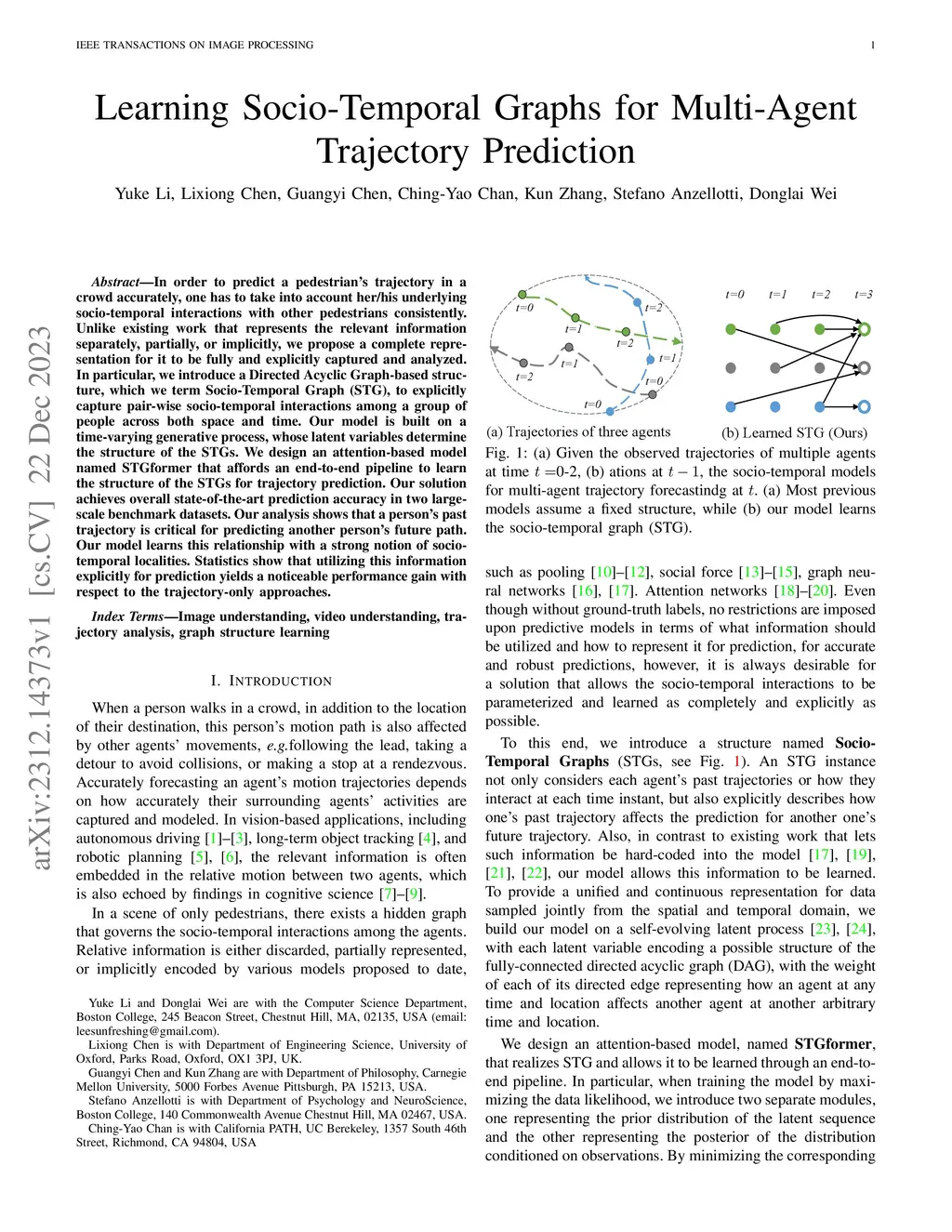 In order to predict a pedestrian's trajectory in a crowd accurately, one has to take into account her/his underlying socio-temporal interactions with other pedestrians consistently. Unlike existing work that represents the relevant information separately, partially, or implicitly, we propose a complete representation for it to be fully and explicitly captured and analyzed. In particular, we introduce a Directed Acyclic Graph-based structure, which we term Socio-Temporal Graph (STG), to explicitly capture pair-wise socio-temporal interactions among a group of people across both space and time. Our model is built on a time-varying generative process, whose latent variables determine the structure of the STGs. We design an attention-based model named STGformer that affords an end-to-end pipeline to learn the structure of the STGs for trajectory prediction. Our solution achieves overall state-of-the-art prediction accuracy in two large-scale benchmark datasets. Our analysis shows that a person's past trajectory is critical for predicting another person's future path. Our model learns this relationship with a strong notion of socio-temporal localities. Statistics show that utilizing this information explicitly for prediction yields a noticeable performance gain with respect to the trajectory-only approaches.