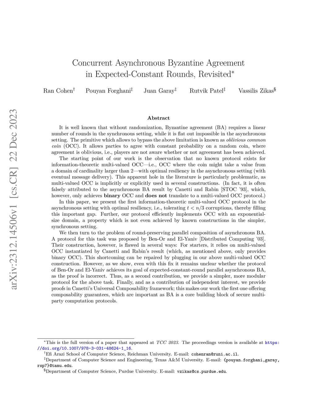It is well known that without randomization, Byzantine agreement (BA) requires a linear number of rounds in the synchronous setting, while it is flat out impossible in the asynchronous setting. The primitive which allows to bypass the above limitation is known as oblivious common coin (OCC). It allows parties to agree with constant probability on a random coin, where agreement is oblivious, i.e., players are not aware whether or not agreement has been achieved. The starting point of our work is the observation that no known protocol exists for information-theoretic multi-valued OCC with optimal resiliency in the asynchronous setting (with eventual message delivery). This apparent hole in the literature is particularly problematic, as multi-valued OCC is implicitly or explicitly used in several constructions. In this paper, we present the first information-theoretic multi-valued OCC protocol in the asynchronous setting with optimal resiliency, i.e., tolerating corruptions, thereby filling this important gap. Further, our protocol efficiently implements OCC with an exponential-size domain, a property which is not even achieved by known constructions in the simpler, synchronous setting. We then turn to the problem of round-preserving parallel composition of asynchronous BA. A protocol for this task was proposed by Ben-Or and El-Yaniv [Distributed Computing '03]. Their construction, however, is flawed in several ways. Thus, as a second contribution, we provide a simpler, more modular protocol for the above task. Finally, and as a contribution of independent interest, we provide proofs in Canetti's Universal Composability framework; this makes our work the first one offering composability guarantees, which are important as BA is a core building block of secure multi-party computation protocols.