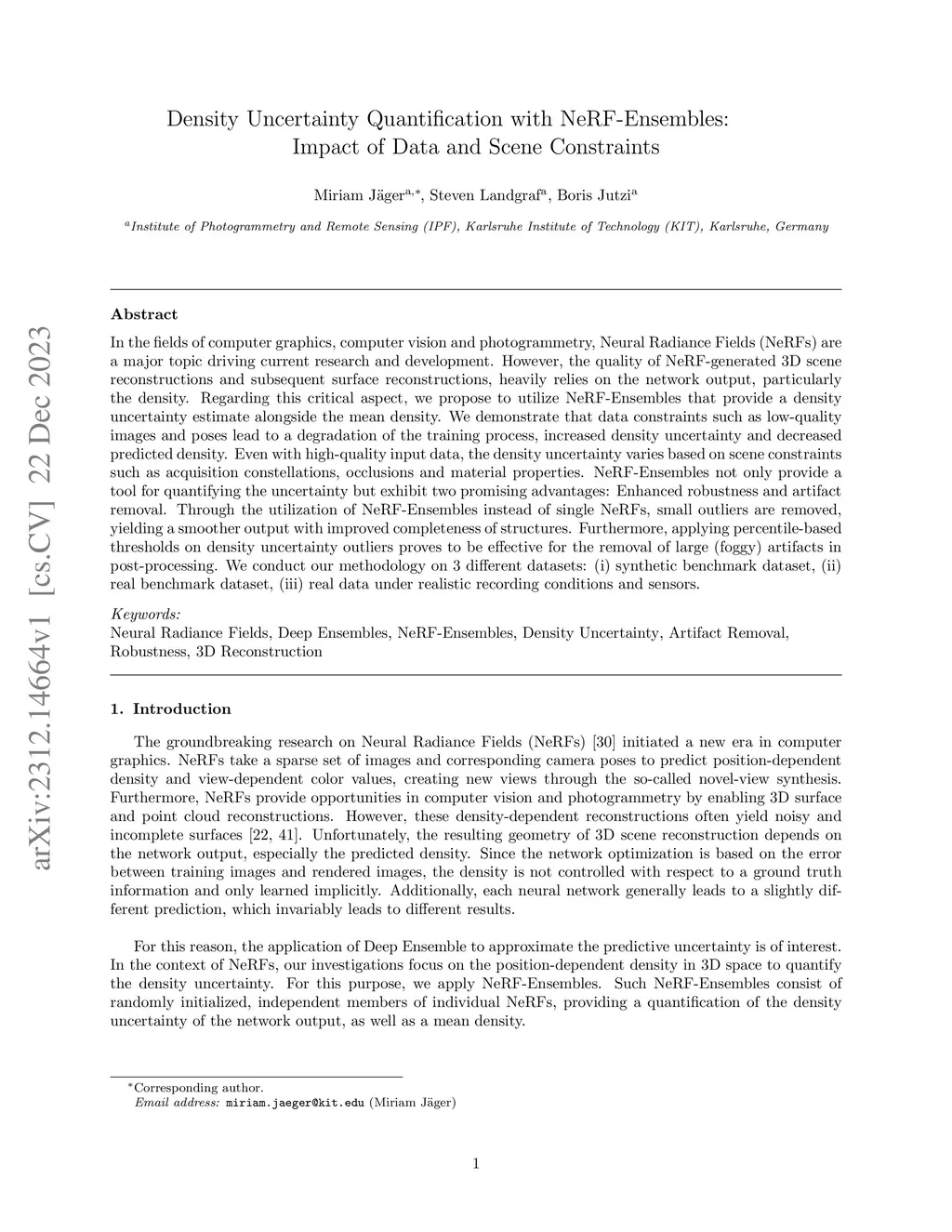 In the fields of computer graphics, computer vision and photogrammetry, Neural Radiance Fields (NeRFs) are a major topic driving current research and development. However, the quality of NeRF-generated 3D scene reconstructions and subsequent surface reconstructions, heavily relies on the network output, particularly the density. Regarding this critical aspect, we propose to utilize NeRF-Ensembles that provide a density uncertainty estimate alongside the mean density. We demonstrate that data constraints such as low-quality images and poses lead to a degradation of the training process, increased density uncertainty and decreased predicted density. Even with high-quality input data, the density uncertainty varies based on scene constraints such as acquisition constellations, occlusions and material properties. NeRF-Ensembles not only provide a tool for quantifying the uncertainty but exhibit two promising advantages: Enhanced robustness and artifact removal. Through the utilization of NeRF-Ensembles instead of single NeRFs, small outliers are removed, yielding a smoother output with improved completeness of structures. Furthermore, applying percentile-based thresholds on density uncertainty outliers proves to be effective for the removal of large (foggy) artifacts in post-processing. We conduct our methodology on 3 different datasets: (i) synthetic benchmark dataset, (ii) real benchmark dataset, (iii) real data under realistic recording conditions and sensors.