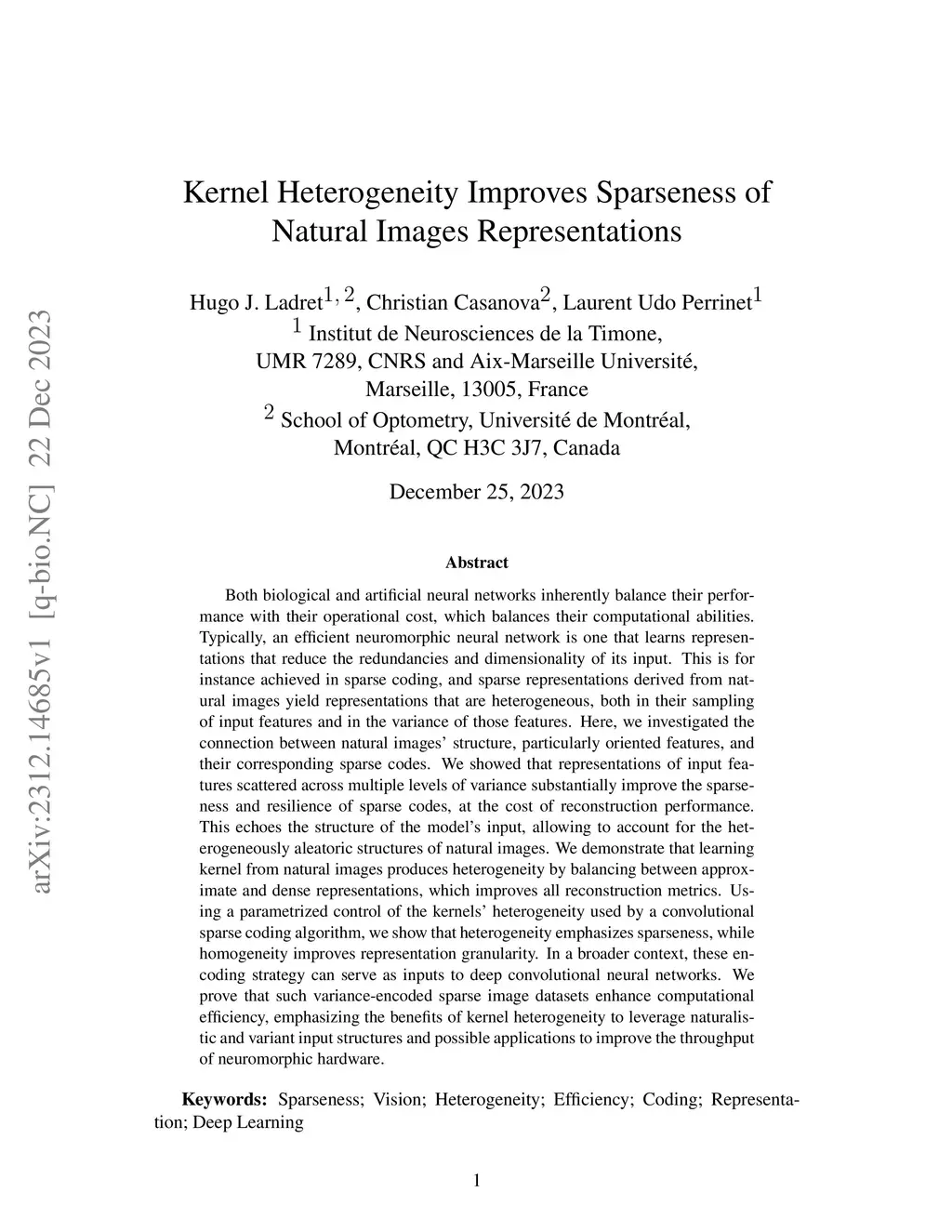 Both biological and artificial neural networks inherently balance their performance with their operational cost, which balances their computational abilities. Typically, an efficient neuromorphic neural network is one that learns representations that reduce the redundancies and dimensionality of its input. This is for instance achieved in sparse coding, and sparse representations derived from natural images yield representations that are heterogeneous, both in their sampling of input features and in the variance of those features. Here, we investigated the connection between natural images' structure, particularly oriented features, and their corresponding sparse codes. We showed that representations of input features scattered across multiple levels of variance substantially improve the sparseness and resilience of sparse codes, at the cost of reconstruction performance. This echoes the structure of the model's input, allowing to account for the heterogeneously aleatoric structures of natural images. We demonstrate that learning kernel from natural images produces heterogeneity by balancing between approximate and dense representations, which improves all reconstruction metrics. Using a parametrized control of the kernels' heterogeneity used by a convolutional sparse coding algorithm, we show that heterogeneity emphasizes sparseness, while homogeneity improves representation granularity. In a broader context, these encoding strategy can serve as inputs to deep convolutional neural networks. We prove that such variance-encoded sparse image datasets enhance computational efficiency, emphasizing the benefits of kernel heterogeneity to leverage naturalistic and variant input structures and possible applications to improve the throughput of neuromorphic hardware.