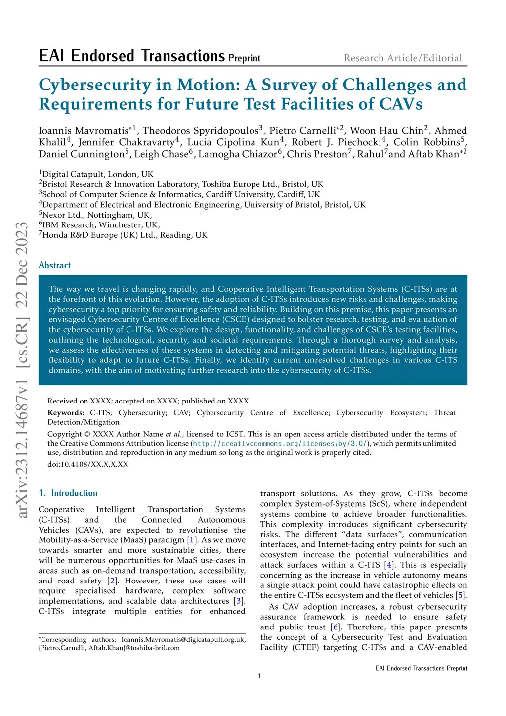 The way we travel is changing rapidly, and Cooperative Intelligent Transportation Systems (C-ITSs) are at the forefront of this evolution. However, the adoption of C-ITSs introduces new risks and challenges, making cybersecurity a top priority for ensuring safety and reliability. Building on this premise, this paper presents an envisaged Cybersecurity Centre of Excellence (CSCE) designed to bolster research, testing, and evaluation of the cybersecurity of C-ITSs. We explore the design, functionality, and challenges of CSCE's testing facilities, outlining the technological, security, and societal requirements. Through a thorough survey and analysis, we assess the effectiveness of these systems in detecting and mitigating potential threats, highlighting their flexibility to adapt to future C-ITSs. Finally, we identify current unresolved challenges in various C-ITS domains, with the aim of motivating further research into the cybersecurity of C-ITSs.