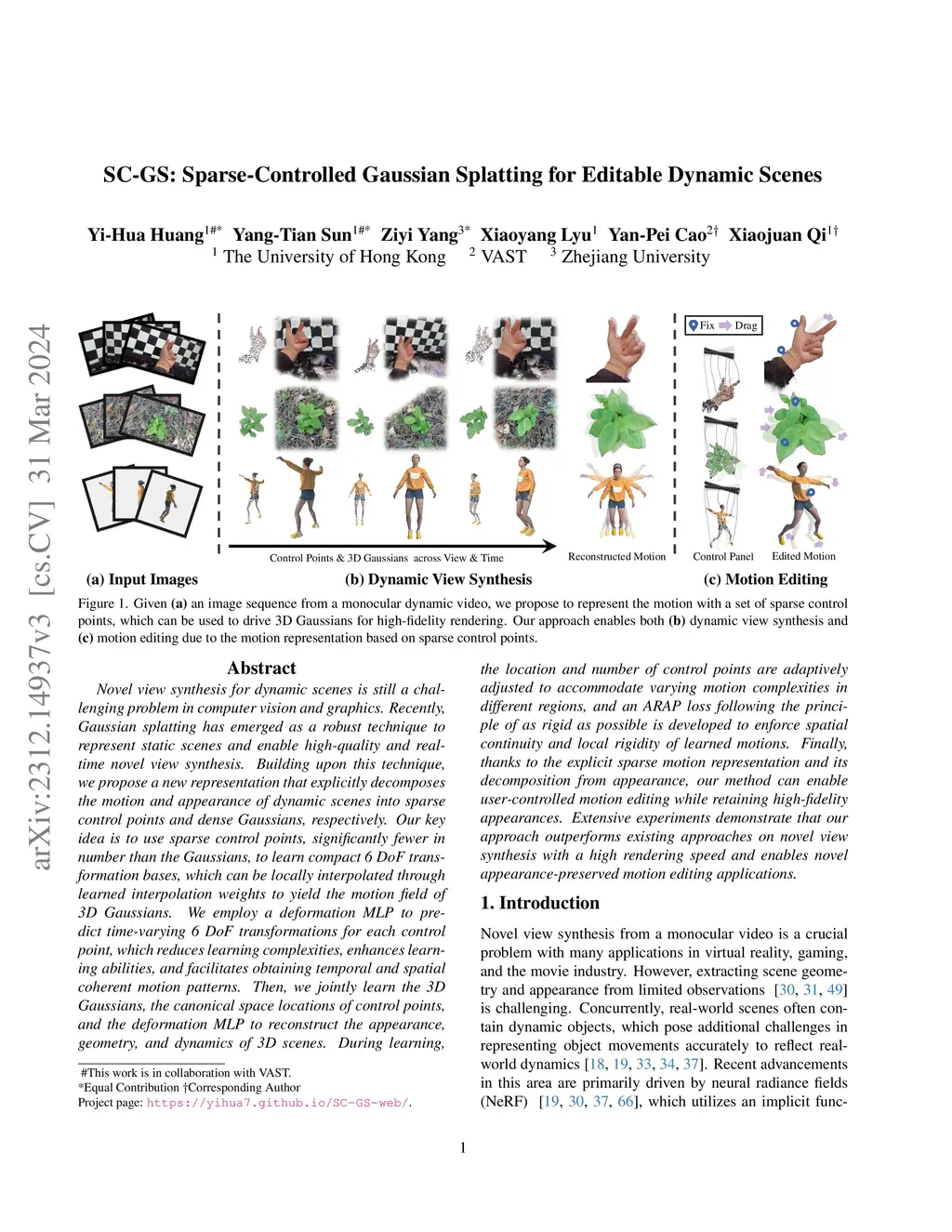 Novel view synthesis for dynamic scenes is still a challenging problem in computer vision and graphics. Recently, Gaussian splatting has emerged as a robust technique to represent static scenes and enable high-quality and real-time novel view synthesis. Building upon this technique, we propose a new representation that explicitly decomposes the motion and appearance of dynamic scenes into sparse control points and dense Gaussians, respectively. Our key idea is to use sparse control points, significantly fewer in number than the Gaussians, to learn compact 6 DoF transformation bases, which can be locally interpolated through learned interpolation weights to yield the motion field of 3D Gaussians. We employ a deformation MLP to predict time-varying 6 DoF transformations for each control point, which reduces learning complexities, enhances learning abilities, and facilitates obtaining temporal and spatial coherent motion patterns. Then, we jointly learn the 3D Gaussians, the canonical space locations of control points, and the deformation MLP to reconstruct the appearance, geometry, and dynamics of 3D scenes. During learning, the location and number of control points are adaptively adjusted to accommodate varying motion complexities in different regions, and an ARAP loss following the principle of as rigid as possible is developed to enforce spatial continuity and local rigidity of learned motions. Finally, thanks to the explicit sparse motion representation and its decomposition from appearance, our method can enable user-controlled motion editing while retaining high-fidelity appearances. Extensive experiments demonstrate that our approach outperforms existing approaches on novel view synthesis with a high rendering speed and enables novel appearance-preserved motion editing applications. Project page: https://yihua7.github.io/SC-GS-web/