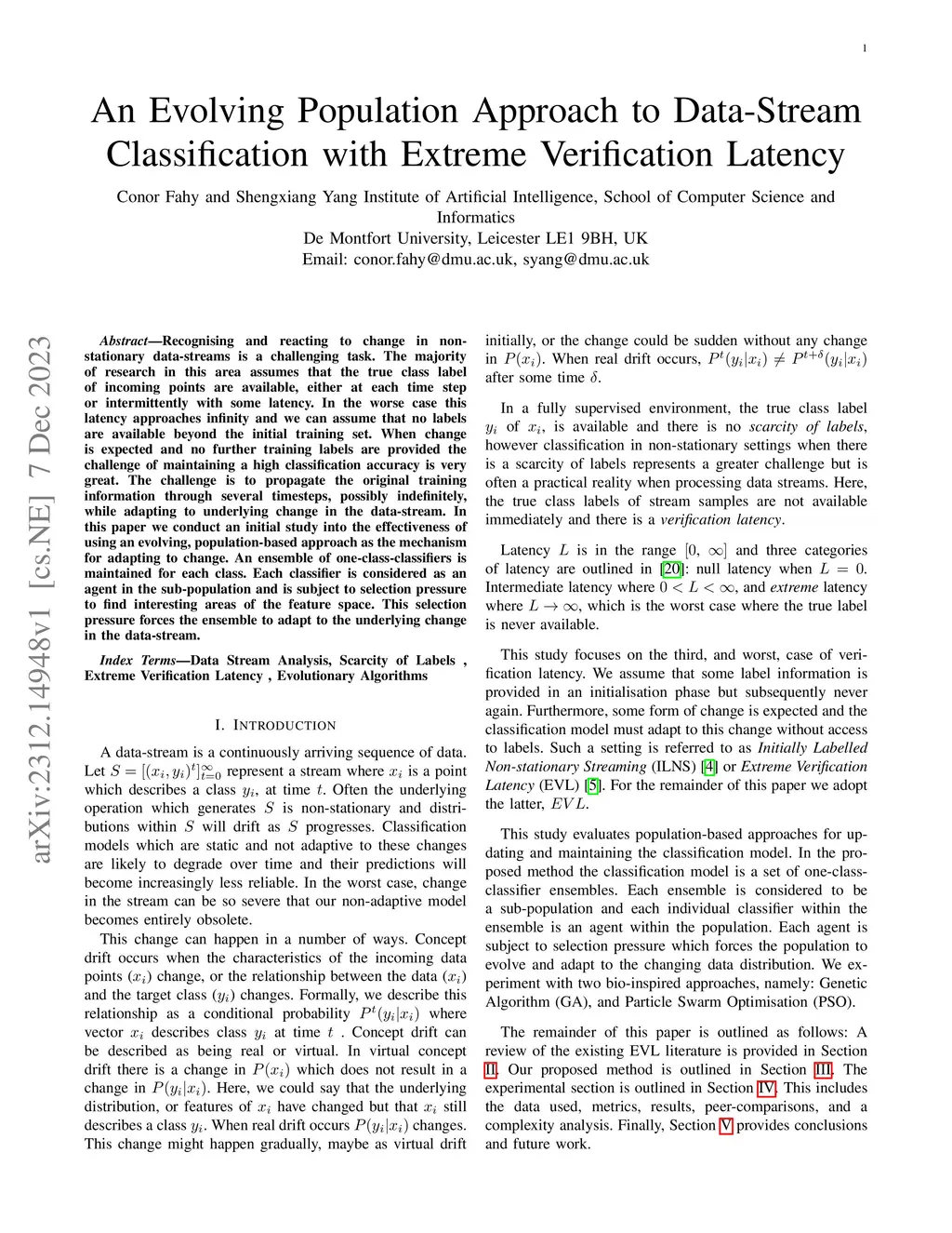 Recognising and reacting to change in non-stationary data-streams is a challenging task. The majority of research in this area assumes that the true class label of incoming points are available, either at each time step or intermittently with some latency. In the worse case this latency approaches infinity and we can assume that no labels are available beyond the initial training set. When change is expected and no further training labels are provided the challenge of maintaining a high classification accuracy is very great. The challenge is to propagate the original training information through several timesteps, possibly indefinitely, while adapting to underlying change in the data-stream. In this paper we conduct an initial study into the effectiveness of using an evolving, population-based approach as the mechanism for adapting to change. An ensemble of one-class-classifiers is maintained for each class. Each classifier is considered as an agent in the sub-population and is subject to selection pressure to find interesting areas of the feature space. This selection pressure forces the ensemble to adapt to the underlying change in the data-stream.
