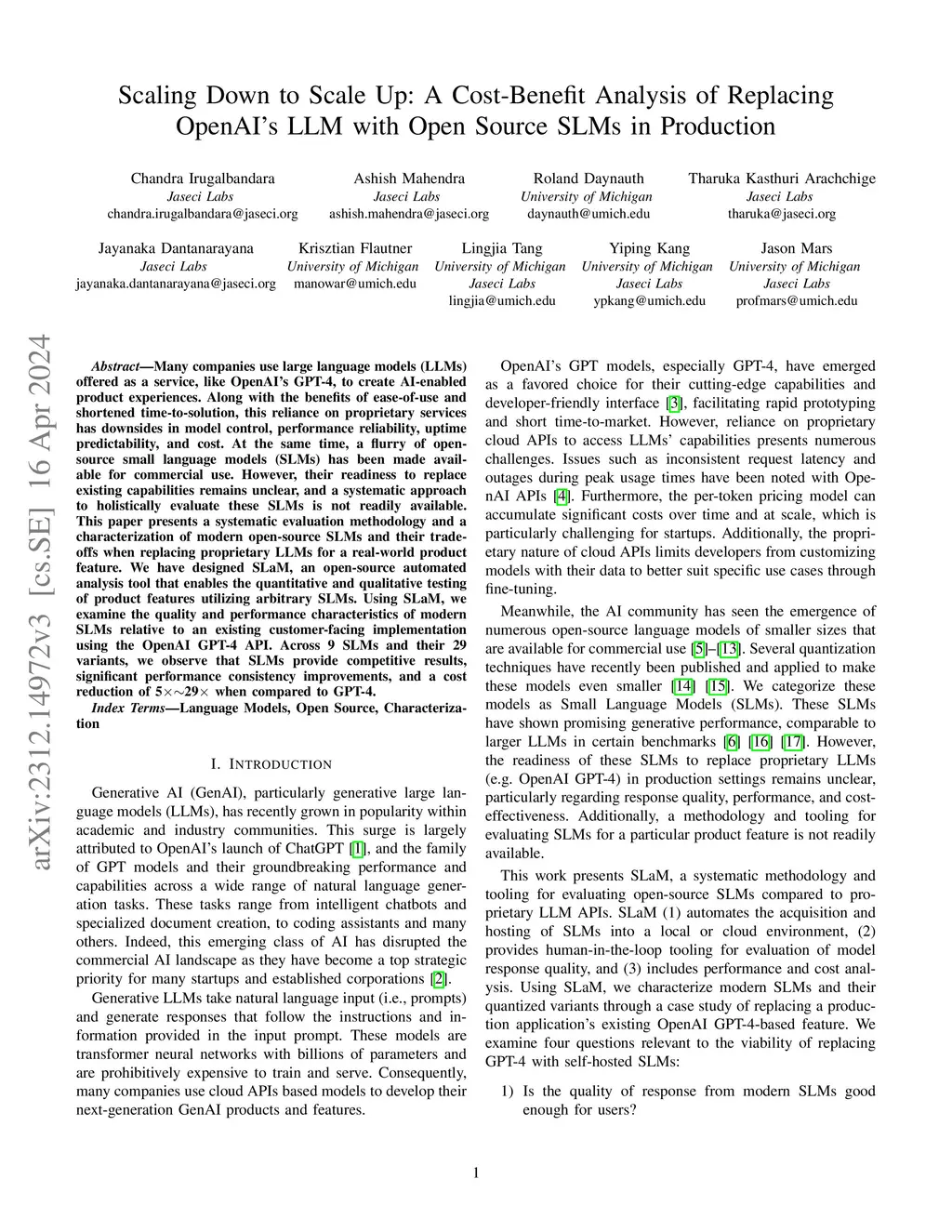 Many companies rely on APIs of managed AI models such as OpenAI's GPT-4 to create AI-enabled experiences in their products. Along with the benefits of ease of use and shortened time to production, this reliance on proprietary APIs has downsides in terms of model control, performance reliability, up-time predictability, and cost. At the same time, there has been a flurry of open source small language models (SLMs) that have been made available for commercial use. However, their readiness to replace existing capabilities remains unclear, and a systematic approach to test these models is not readily available. In this paper, we present a systematic evaluation methodology for, and characterization of, modern open source SLMs and their trade-offs when replacing a proprietary LLM APIs for a real-world product feature. We have designed SLaM, an automated analysis tool that enables the quantitative and qualitative testing of product features utilizing arbitrary SLMs. Using SLaM, we examine both the quality and the performance characteristics of modern SLMs relative to an existing customer-facing OpenAI-based implementation. We find that across 9 SLMs and 29 variants, we observe competitive quality-of-results for our use case, significant performance consistency improvement, and a cost reduction of 5x-29x when compared to OpenAI GPT-4.