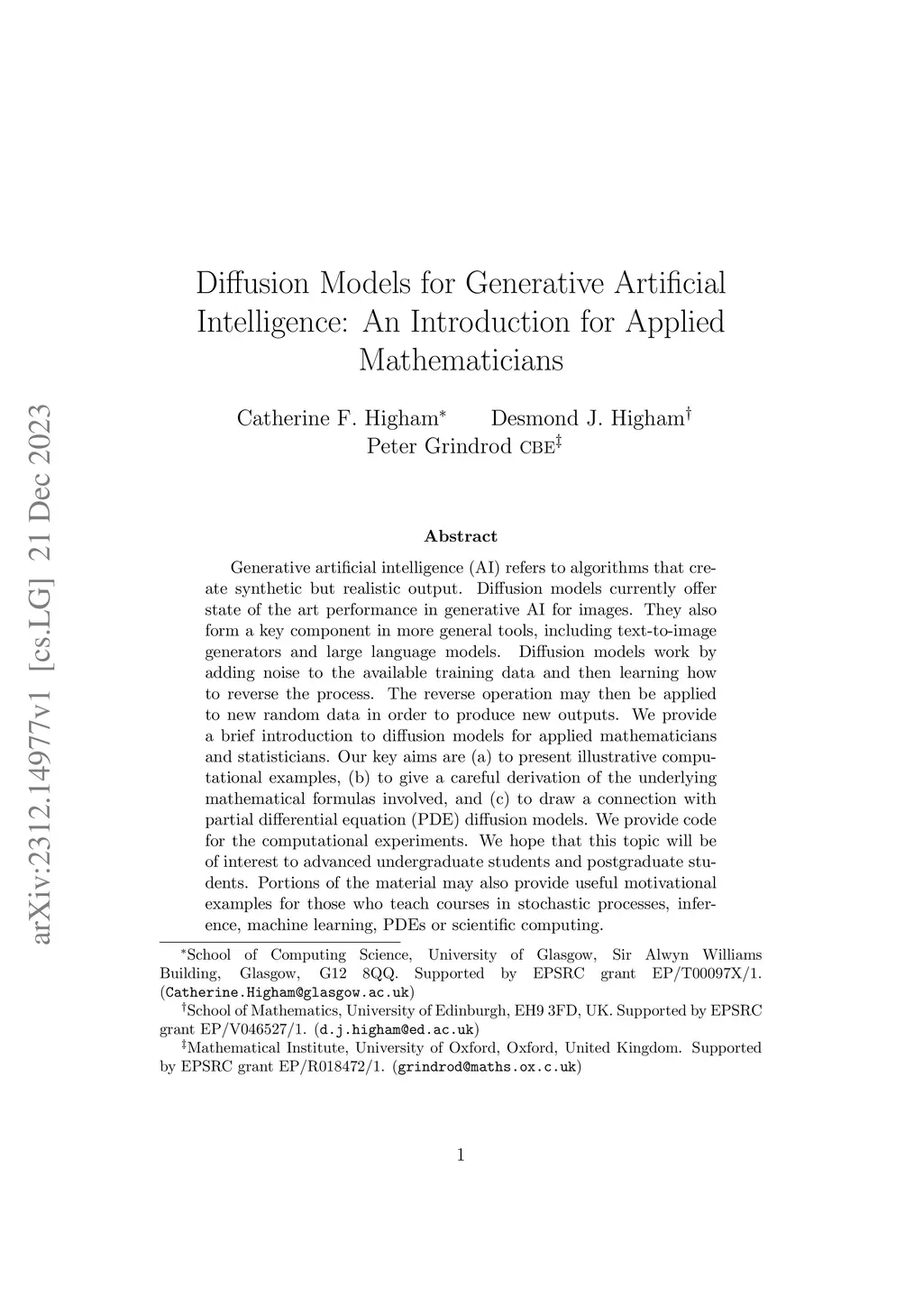 Generative artificial intelligence (AI) refers to algorithms that create synthetic but realistic output. Diffusion models currently offer state of the art performance in generative AI for images. They also form a key component in more general tools, including text-to-image generators and large language models. Diffusion models work by adding noise to the available training data and then learning how to reverse the process. The reverse operation may then be applied to new random data in order to produce new outputs. We provide a brief introduction to diffusion models for applied mathematicians and statisticians. Our key aims are (a) to present illustrative computational examples, (b) to give a careful derivation of the underlying mathematical formulas involved, and (c) to draw a connection with partial differential equation (PDE) diffusion models. We provide code for the computational experiments. We hope that this topic will be of interest to advanced undergraduate students and postgraduate students. Portions of the material may also provide useful motivational examples for those who teach courses in stochastic processes, inference, machine learning, PDEs or scientific computing.