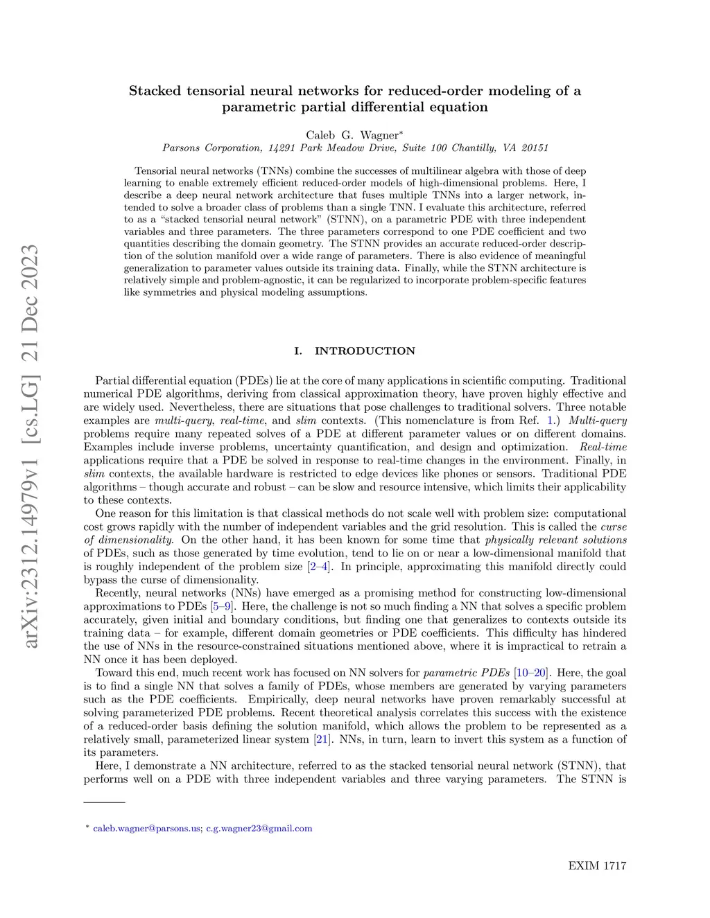 Tensorial neural networks (TNNs) combine the successes of multilinear algebra with those of deep learning to enable extremely efficient reduced-order models of high-dimensional problems. Here, I describe a deep neural network architecture that fuses multiple TNNs into a larger network, intended to solve a broader class of problems than a single TNN. I evaluate this architecture, referred to as a "stacked tensorial neural network" (STNN), on a parametric PDE with three independent variables and three parameters. The three parameters correspond to one PDE coefficient and two quantities describing the domain geometry. The STNN provides an accurate reduced-order description of the solution manifold over a wide range of parameters. There is also evidence of meaningful generalization to parameter values outside its training data. Finally, while the STNN architecture is relatively simple and problem agnostic, it can be regularized to incorporate problem-specific features like symmetries and physical modeling assumptions.