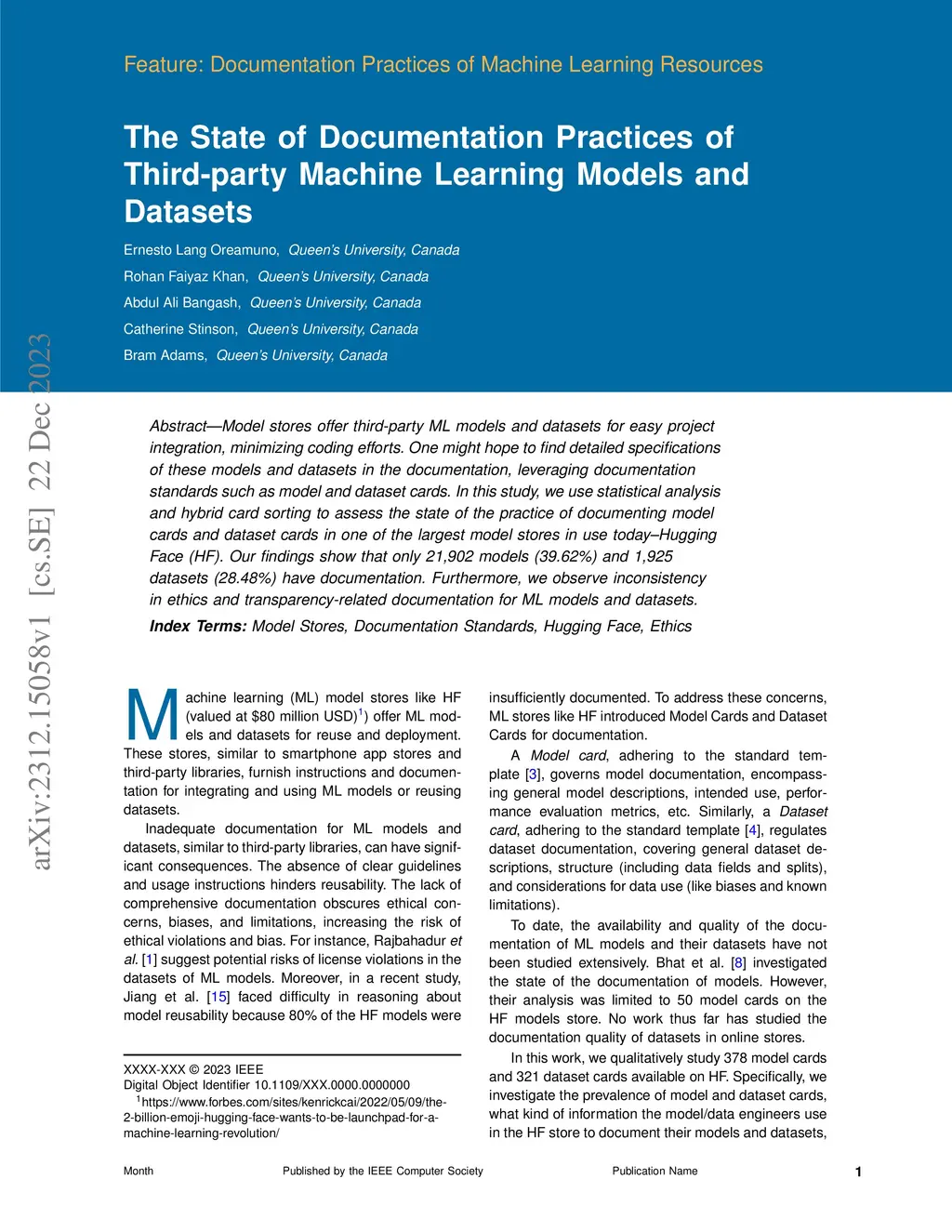 Model stores offer third-party ML models and datasets for easy project integration, minimizing coding efforts. One might hope to find detailed specifications of these models and datasets in the documentation, leveraging documentation standards such as model and dataset cards. In this study, we use statistical analysis and hybrid card sorting to assess the state of the practice of documenting model cards and dataset cards in one of the largest model stores in use today--Hugging Face (HF). Our findings show that only 21,902 models (39.62\%) and 1,925 datasets (28.48\%) have documentation. Furthermore, we observe inconsistency in ethics and transparency-related documentation for ML models and datasets.