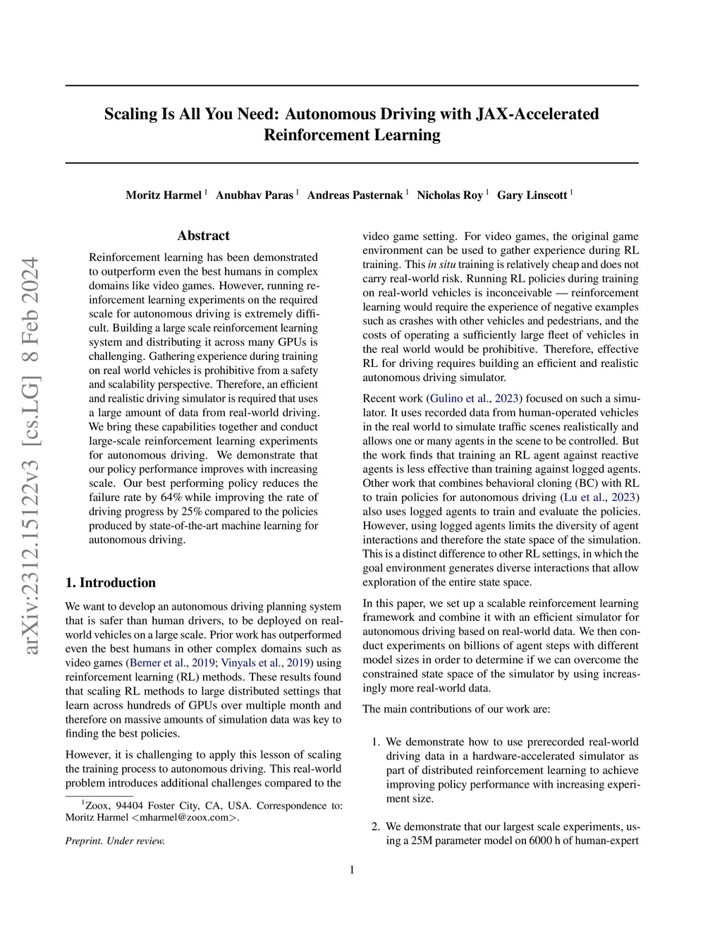 Reinforcement learning has been demonstrated to outperform even the best humans in complex domains like video games. However, running reinforcement learning experiments on the required scale for autonomous driving is extremely difficult. Building a large scale reinforcement learning system and distributing it across many GPUs is challenging. Gathering experience during training on real world vehicles is prohibitive from a safety and scalability perspective. Therefore, an efficient and realistic driving simulator is required that uses a large amount of data from real-world driving. We bring these capabilities together and conduct large-scale reinforcement learning experiments for autonomous driving. We demonstrate that our policy performance improves with increasing scale. Our best performing policy reduces the failure rate by 64% while improving the rate of driving progress by 25% compared to the policies produced by state-of-the-art machine learning for autonomous driving.