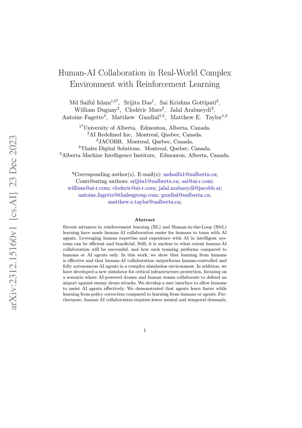 Recent advances in reinforcement learning (RL) and Human-in-the-Loop (HitL) learning have made human-AI collaboration easier for humans to team with AI agents. Leveraging human expertise and experience with AI in intelligent systems can be efficient and beneficial. Still, it is unclear to what extent human-AI collaboration will be successful, and how such teaming performs compared to humans or AI agents only. In this work, we show that learning from humans is effective and that human-AI collaboration outperforms human-controlled and fully autonomous AI agents in a complex simulation environment. In addition, we have developed a new simulator for critical infrastructure protection, focusing on a scenario where AI-powered drones and human teams collaborate to defend an airport against enemy drone attacks. We develop a user interface to allow humans to assist AI agents effectively. We demonstrated that agents learn faster while learning from policy correction compared to learning from humans or agents. Furthermore, human-AI collaboration requires lower mental and temporal demands, reduces human effort, and yields higher performance than if humans directly controlled all agents. In conclusion, we show that humans can provide helpful advice to the RL agents, allowing them to improve learning in a multi-agent setting.