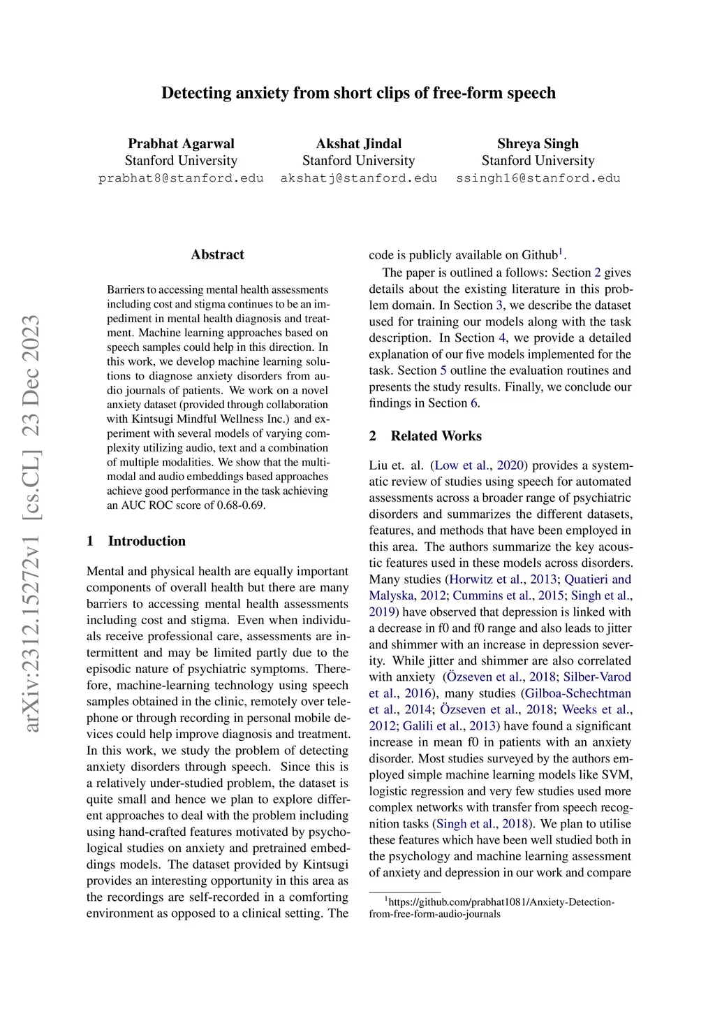Barriers to accessing mental health assessments including cost and stigma continues to be an impediment in mental health diagnosis and treatment. Machine learning approaches based on speech samples could help in this direction. In this work, we develop machine learning solutions to diagnose anxiety disorders from audio journals of patients. We work on a novel anxiety dataset (provided through collaboration with Kintsugi Mindful Wellness Inc.) and experiment with several models of varying complexity utilizing audio, text and a combination of multiple modalities. We show that the multi-modal and audio embeddings based approaches achieve good performance in the task achieving an AUC ROC score of 0.68-0.69.