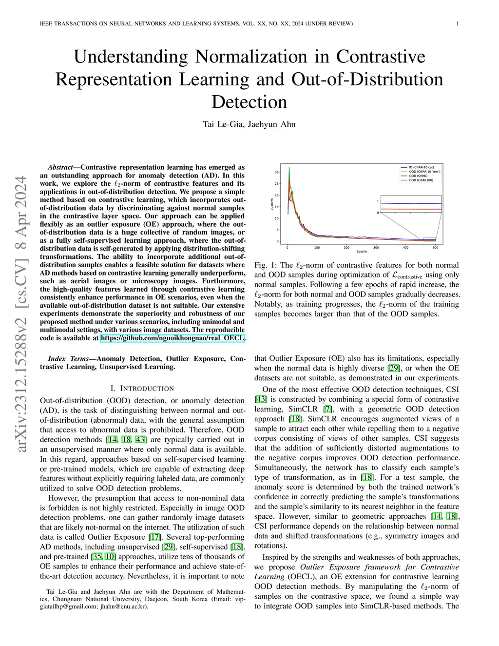 Contrastive representation learning has emerged as an outstanding approach for anomaly detection. In this work, we explore the -norm of contrastive features and its applications in out-of-distribution detection. We propose a simple method based on contrastive learning, which incorporates out-of-distribution data by discriminating against normal samples in the contrastive layer space. Our approach can be applied flexibly as an outlier exposure (OE) approach, where the out-of-distribution data is a huge collective of random images, or as a fully self-supervised learning approach, where the out-of-distribution data is self-generated by applying distribution-shifting transformations. The ability to incorporate additional out-of-distribution samples enables a feasible solution for datasets where AD methods based on contrastive learning generally underperform, such as aerial images or microscopy images. Furthermore, the high-quality features learned through contrastive learning consistently enhance performance in OE scenarios, even when the available out-of-distribution dataset is not diverse enough. Our extensive experiments demonstrate the superiority of our proposed method under various scenarios, including unimodal and multimodal settings, with various image datasets.