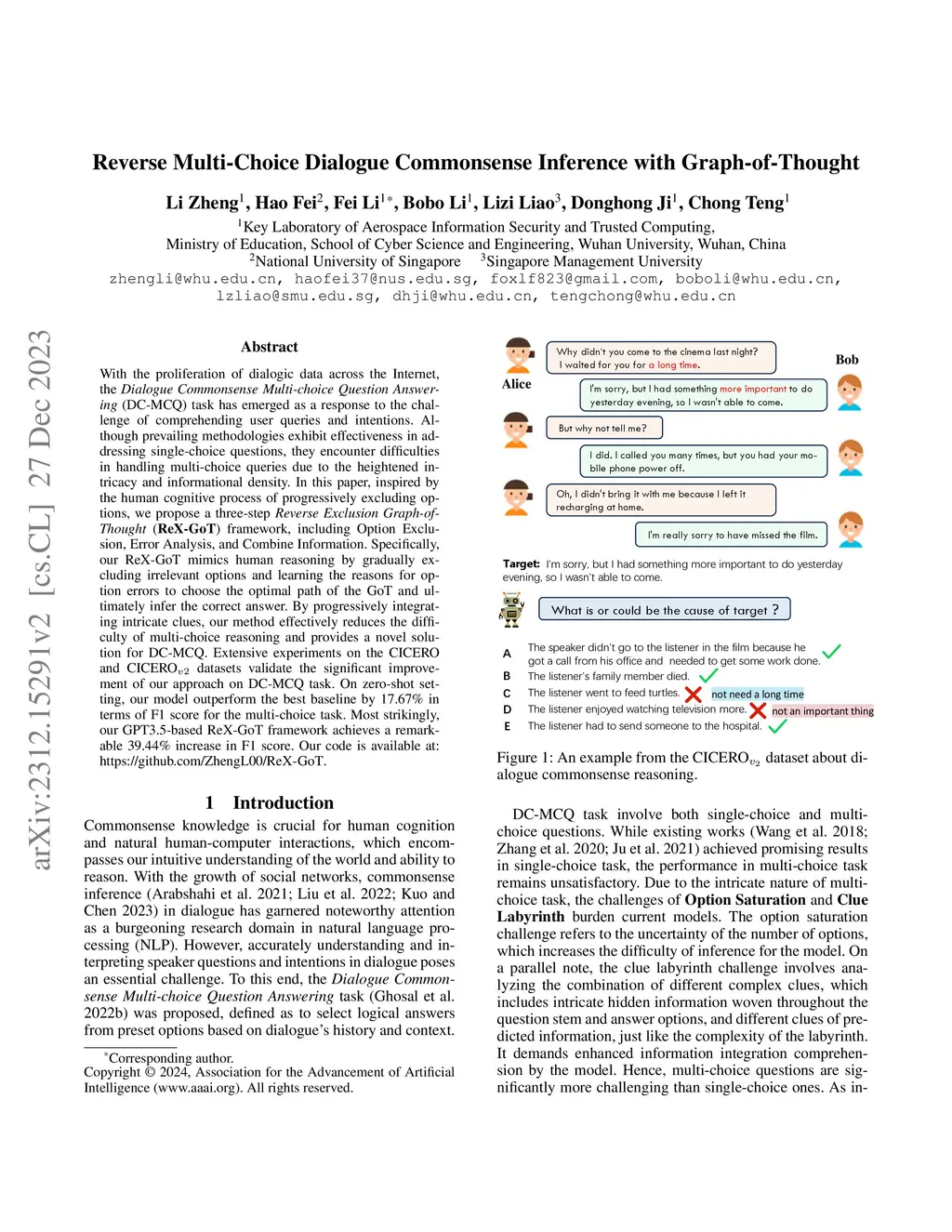 With the proliferation of dialogic data across the Internet, the Dialogue Commonsense Multi-choice Question Answering (DC-MCQ) task has emerged as a response to the challenge of comprehending user queries and intentions. Although prevailing methodologies exhibit effectiveness in addressing single-choice questions, they encounter difficulties in handling multi-choice queries due to the heightened intricacy and informational density. In this paper, inspired by the human cognitive process of progressively excluding options, we propose a three-step Reverse Exclusion Graph-of-Thought (ReX-GoT) framework, including Option Exclusion, Error Analysis, and Combine Information. Specifically, our ReX-GoT mimics human reasoning by gradually excluding irrelevant options and learning the reasons for option errors to choose the optimal path of the GoT and ultimately infer the correct answer. By progressively integrating intricate clues, our method effectively reduces the difficulty of multi-choice reasoning and provides a novel solution for DC-MCQ. Extensive experiments on the CICERO and CICERO datasets validate the significant improvement of our approach on DC-MCQ task. On zero-shot setting, our model outperform the best baseline by 17.67% in terms of F1 score for the multi-choice task. Most strikingly, our GPT3.5-based ReX-GoT framework achieves a remarkable 39.44% increase in F1 score.