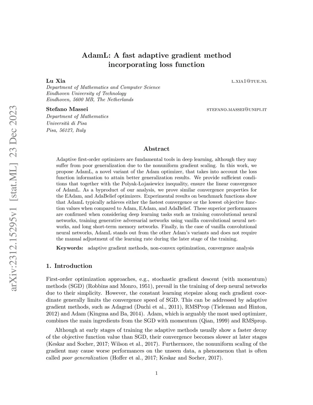 Adaptive first-order optimizers are fundamental tools in deep learning, although they may suffer from poor generalization due to the nonuniform gradient scaling. In this work, we propose AdamL, a novel variant of the Adam optimizer, that takes into account the loss function information to attain better generalization results. We provide sufficient conditions that together with the Polyak-Lojasiewicz inequality, ensure the linear convergence of AdamL. As a byproduct of our analysis, we prove similar convergence properties for the EAdam, and AdaBelief optimizers. Experimental results on benchmark functions show that AdamL typically achieves either the fastest convergence or the lowest objective function values when compared to Adam, EAdam, and AdaBelief. These superior performances are confirmed when considering deep learning tasks such as training convolutional neural networks, training generative adversarial networks using vanilla convolutional neural networks, and long short-term memory networks. Finally, in the case of vanilla convolutional neural networks, AdamL stands out from the other Adam's variants and does not require the manual adjustment of the learning rate during the later stage of the training.