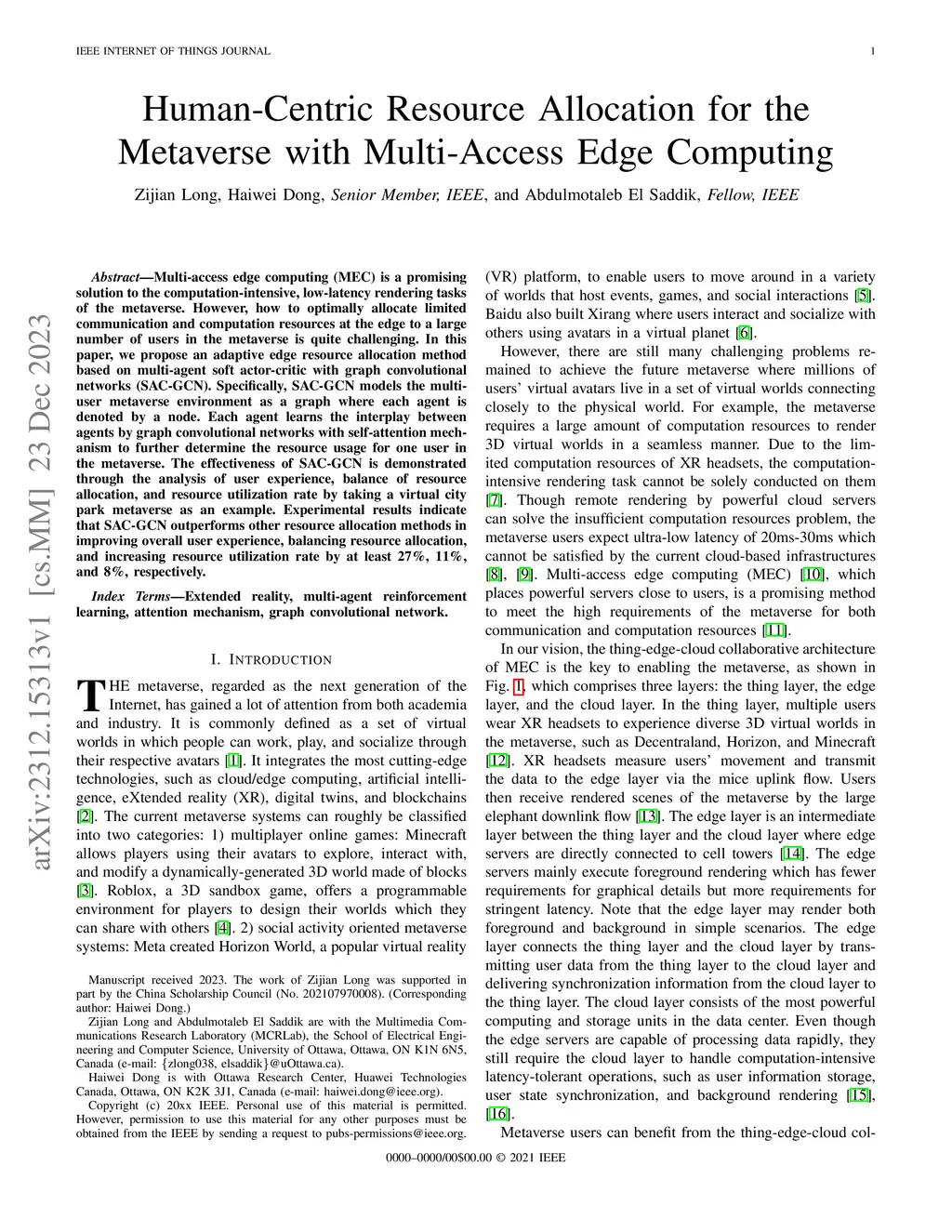 Multi-access edge computing (MEC) is a promising solution to the computation-intensive, low-latency rendering tasks of the metaverse. However, how to optimally allocate limited communication and computation resources at the edge to a large number of users in the metaverse is quite challenging. In this paper, we propose an adaptive edge resource allocation method based on multi-agent soft actor-critic with graph convolutional networks (SAC-GCN). Specifically, SAC-GCN models the multi-user metaverse environment as a graph where each agent is denoted by a node. Each agent learns the interplay between agents by graph convolutional networks with self-attention mechanism to further determine the resource usage for one user in the metaverse. The effectiveness of SAC-GCN is demonstrated through the analysis of user experience, balance of resource allocation, and resource utilization rate by taking a virtual city park metaverse as an example. Experimental results indicate that SAC-GCN outperforms other resource allocation methods in improving overall user experience, balancing resource allocation, and increasing resource utilization rate by at least 27%, 11%, and 8%, respectively.