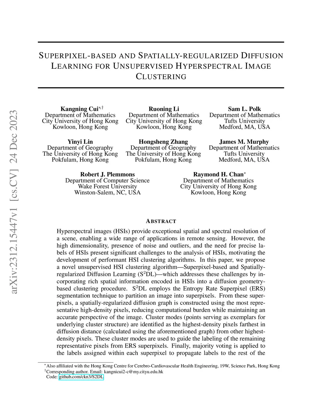 Hyperspectral images (HSIs) provide exceptional spatial and spectral resolution of a scene, crucial for various remote sensing applications. However, the high dimensionality, presence of noise and outliers, and the need for precise labels of HSIs present significant challenges to HSIs analysis, motivating the development of performant HSI clustering algorithms. This paper introduces a novel unsupervised HSI clustering algorithm, Superpixel-based and Spatially-regularized Diffusion Learning (S2DL), which addresses these challenges by incorporating rich spatial information encoded in HSIs into diffusion geometry-based clustering. S2DL employs the Entropy Rate Superpixel (ERS) segmentation technique to partition an image into superpixels, then constructs a spatially-regularized diffusion graph using the most representative high-density pixels. This approach reduces computational burden while preserving accuracy. Cluster modes, serving as exemplars for underlying cluster structure, are identified as the highest-density pixels farthest in diffusion distance from other highest-density pixels. These modes guide the labeling of the remaining representative pixels from ERS superpixels. Finally, majority voting is applied to the labels assigned within each superpixel to propagate labels to the rest of the image. This spatial-spectral approach simultaneously simplifies graph construction, reduces computational cost, and improves clustering performance. S2DL's performance is illustrated with extensive experiments on three publicly available, real-world HSIs: Indian Pines, Salinas, and Salinas A. Additionally, we apply S2DL to landscape-scale, unsupervised mangrove species mapping in the Mai Po Nature Reserve, Hong Kong, using a Gaofen-5 HSI. The success of S2DL in these diverse numerical experiments indicates its efficacy on a wide range of important unsupervised remote sensing analysis tasks.