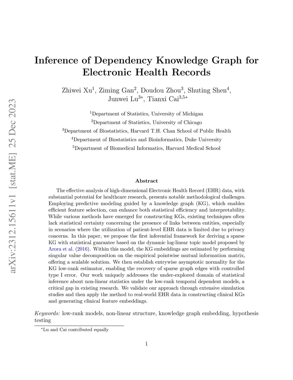 The effective analysis of high-dimensional Electronic Health Record (EHR) data, with substantial potential for healthcare research, presents notable methodological challenges. Employing predictive modeling guided by a knowledge graph (KG), which enables efficient feature selection, can enhance both statistical efficiency and interpretability. While various methods have emerged for constructing KGs, existing techniques often lack statistical certainty concerning the presence of links between entities, especially in scenarios where the utilization of patient-level EHR data is limited due to privacy concerns. In this paper, we propose the first inferential framework for deriving a sparse KG with statistical guarantee based on the dynamic log-linear topic model proposed by \cite{arora2016latent}. Within this model, the KG embeddings are estimated by performing singular value decomposition on the empirical pointwise mutual information matrix, offering a scalable solution. We then establish entrywise asymptotic normality for the KG low-rank estimator, enabling the recovery of sparse graph edges with controlled type I error. Our work uniquely addresses the under-explored domain of statistical inference about non-linear statistics under the low-rank temporal dependent models, a critical gap in existing research. We validate our approach through extensive simulation studies and then apply the method to real-world EHR data in constructing clinical KGs and generating clinical feature embeddings.