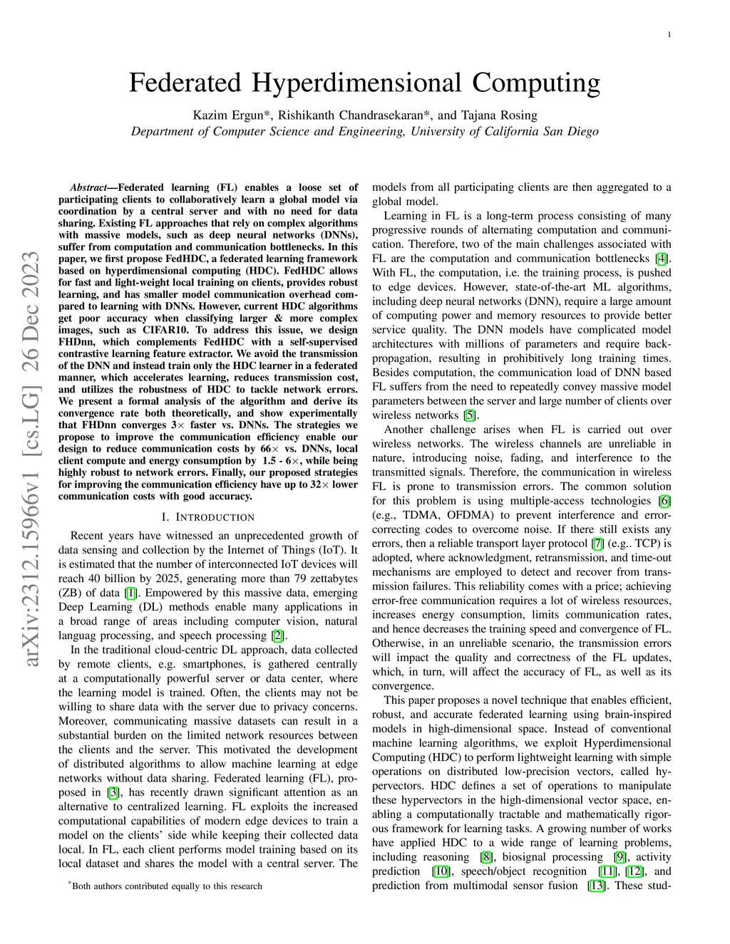 Federated learning (FL) enables a loose set of participating clients to collaboratively learn a global model via coordination by a central server and with no need for data sharing. Existing FL approaches that rely on complex algorithms with massive models, such as deep neural networks (DNNs), suffer from computation and communication bottlenecks. In this paper, we first propose FedHDC, a federated learning framework based on hyperdimensional computing (HDC). FedHDC allows for fast and light-weight local training on clients, provides robust learning, and has smaller model communication overhead compared to learning with DNNs. However, current HDC algorithms get poor accuracy when classifying larger & more complex images, such as CIFAR10. To address this issue, we design FHDnn, which complements FedHDC with a self-supervised contrastive learning feature extractor. We avoid the transmission of the DNN and instead train only the HDC learner in a federated manner, which accelerates learning, reduces transmission cost, and utilizes the robustness of HDC to tackle network errors. We present a formal analysis of the algorithm and derive its convergence rate both theoretically, and show experimentally that FHDnn converges 3 faster vs. DNNs. The strategies we propose to improve the communication efficiency enable our design to reduce communication costs by 66 vs. DNNs, local client compute and energy consumption by ~1.5 - 6, while being highly robust to network errors. Finally, our proposed strategies for improving the communication efficiency have up to 32 lower communication costs with good accuracy.
